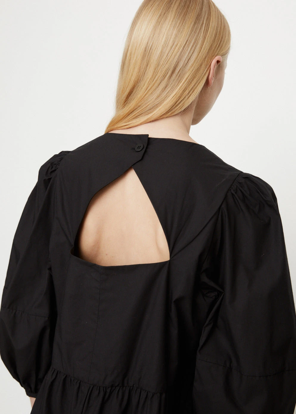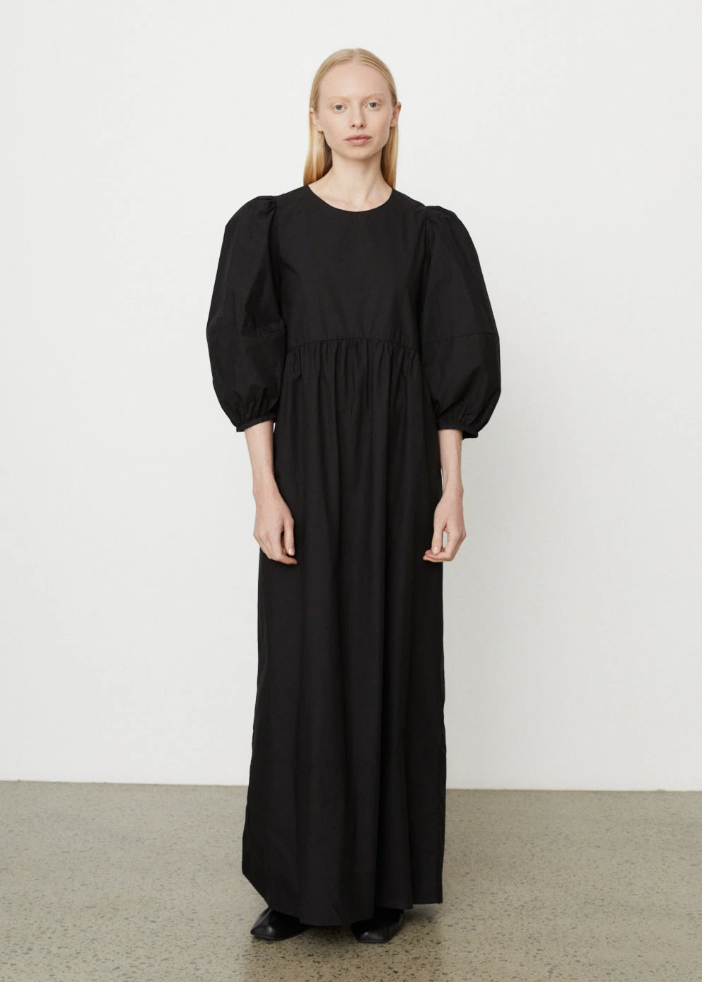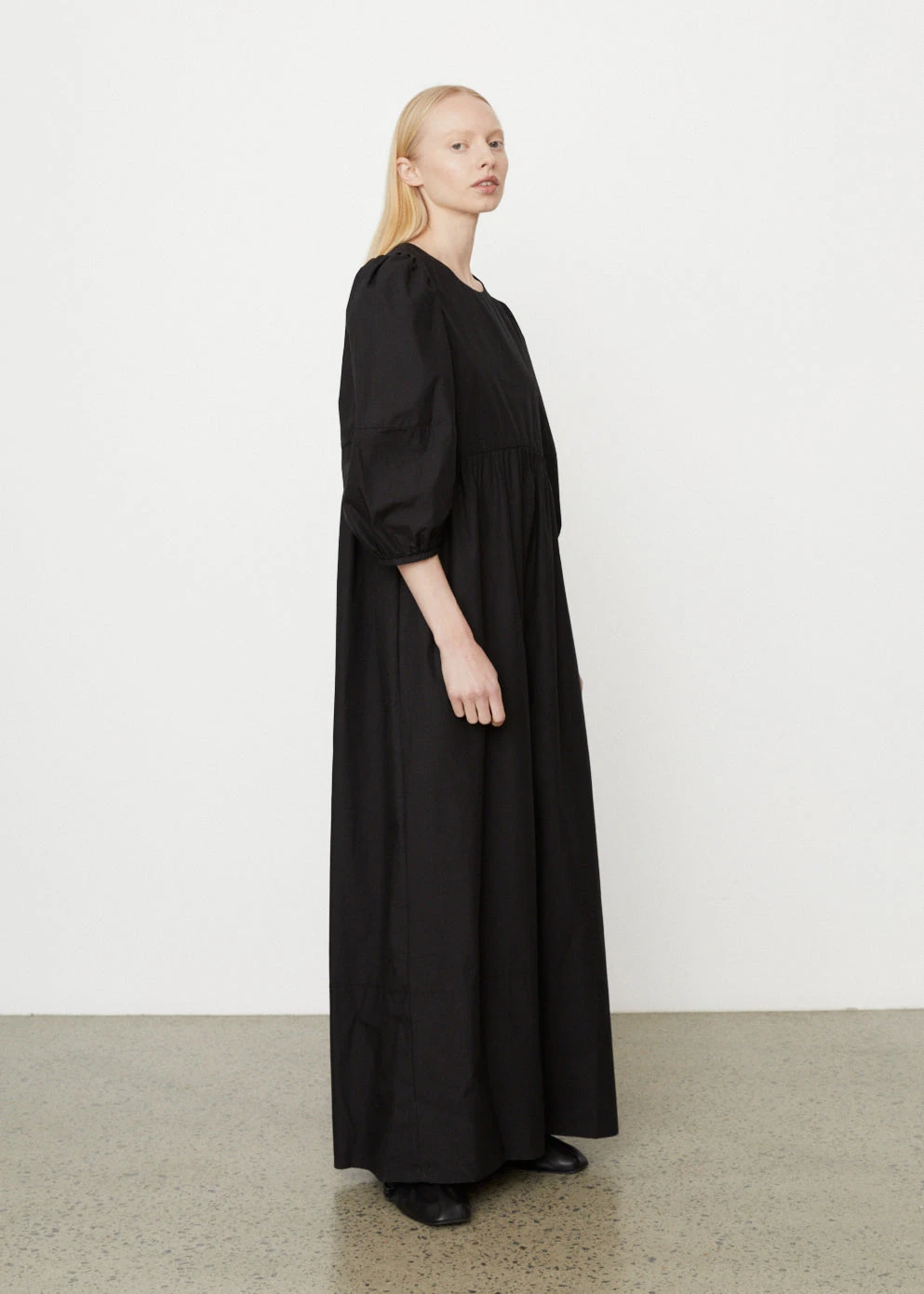 Helen de Kluiver from CAES is redefining wardrobe classics with an anti-fast fashion and pro-slow vision. The Amsterdam-based brand doesn’t believe clothing has to be seasonal – and the 0044 Cotton Midi Dress demonstrates this philosophy at work. Ballooned sleeves, and open-back detail and a floor-skimming hem define the black style.