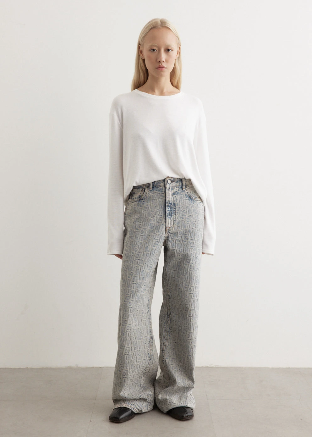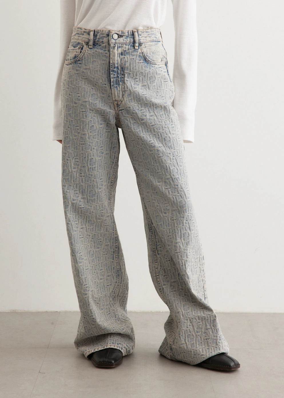 Defined by its experimental take on Scandinavian minimalism, Acne Studios blends technical design with an unexpected palette and androgynous style cues. Crafted from monogram jacquard denim, the 2022 Monogram Jeans 32″ boasts a relaxed, wide leg silhouette. Featuring a 5-pocket-construction and zip fly closure.