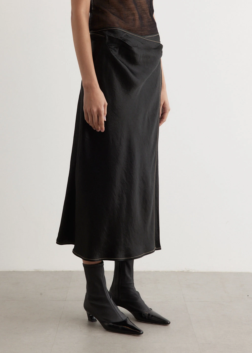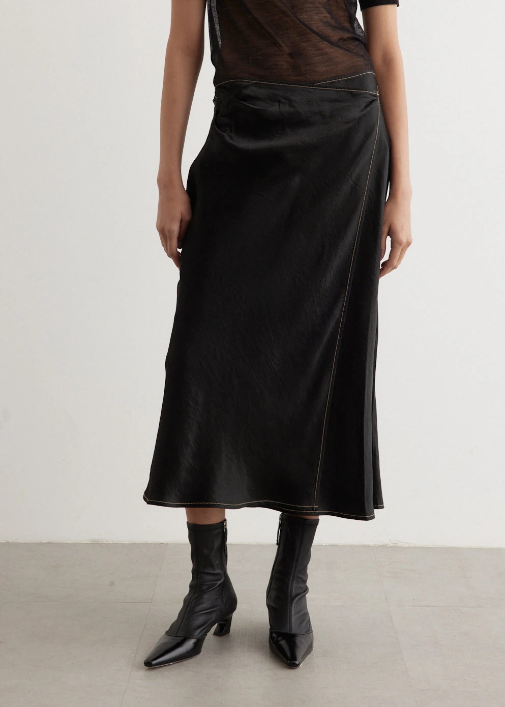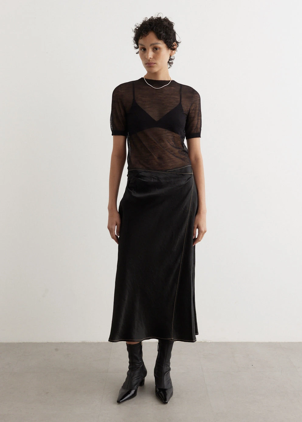 Defined by its experimental take on Scandinavian minimalism, Acne Studios blends technical design with an unexpected palette and androgynous style cues. The label’s signature off-beat accessories add personality to everyday outfits thanks to subtle details. The Iala Satin Wrap Skirt is crafted from a crinkled satin fabric, detailed with a tie waist and contrast topstitching. Finished sitting mid-length with a pleated waist.