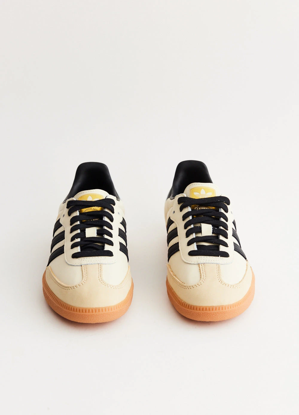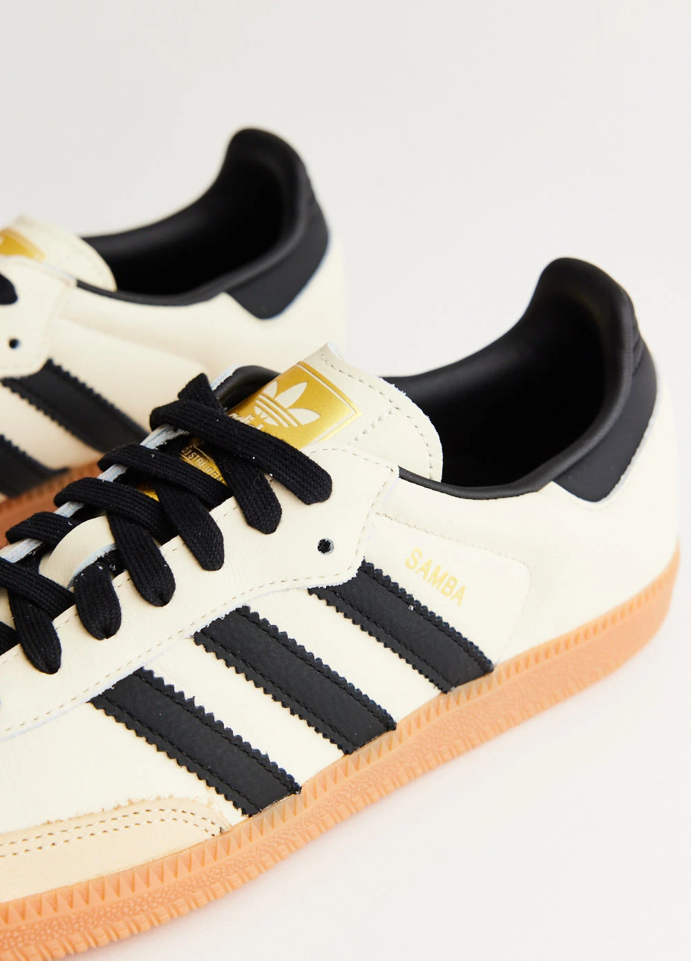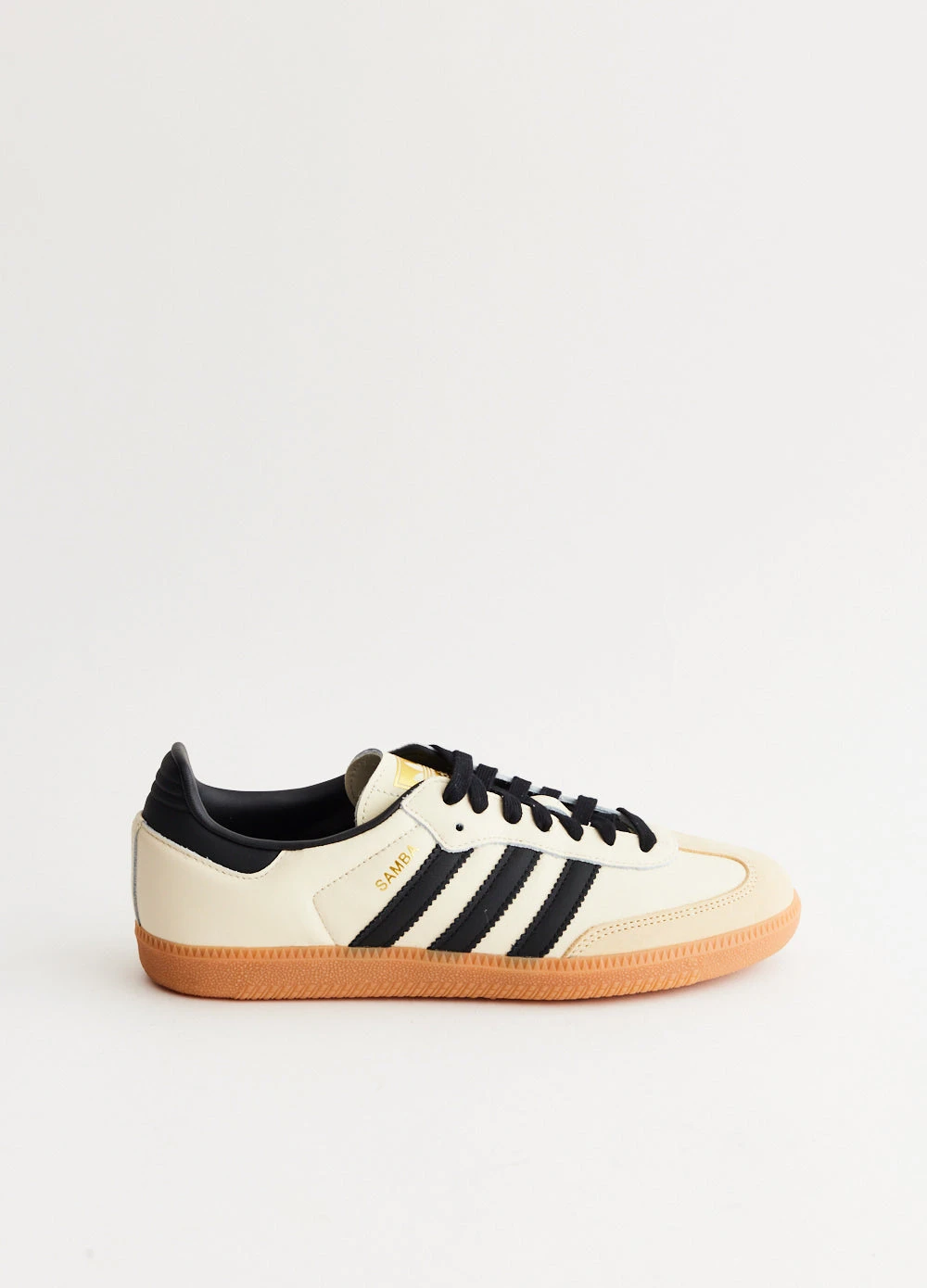 Adidas was founded in Germany in 1949 and has since been a driving force internationally in the sportswear industry, plus more recently, the streetwear space. Crafted with a leather upper with nubuck overlays, the Women’s Samba OG ‘Cream White’ Sneakers are highlighted by bold black touches at the signature 3-Stripes and its gold-tone details. It sits atop a rubber gumsole for a classic look.