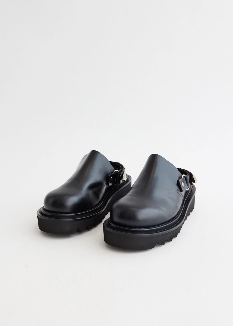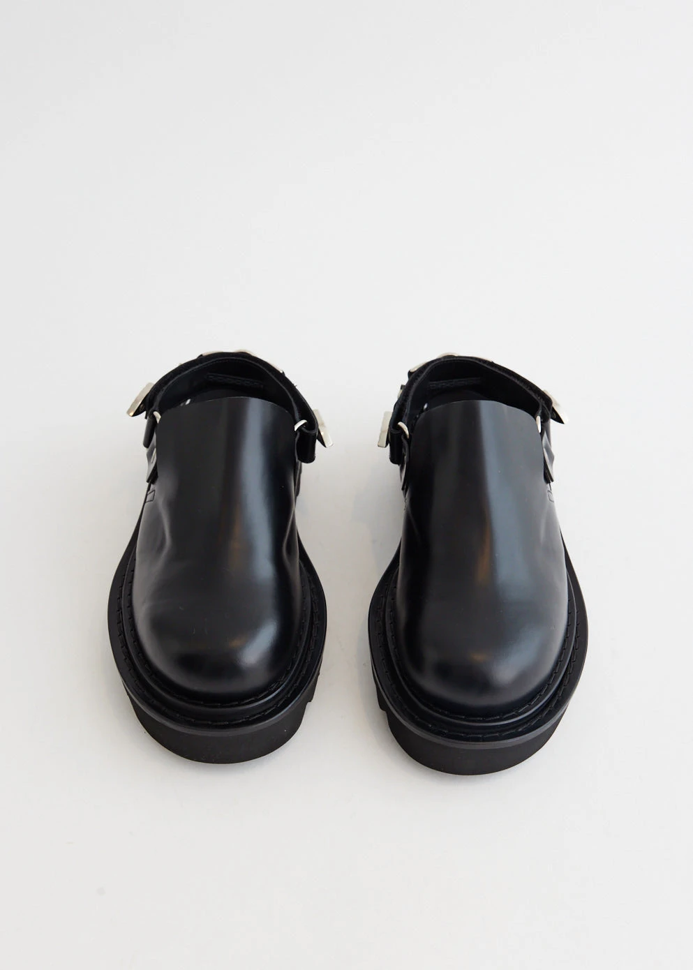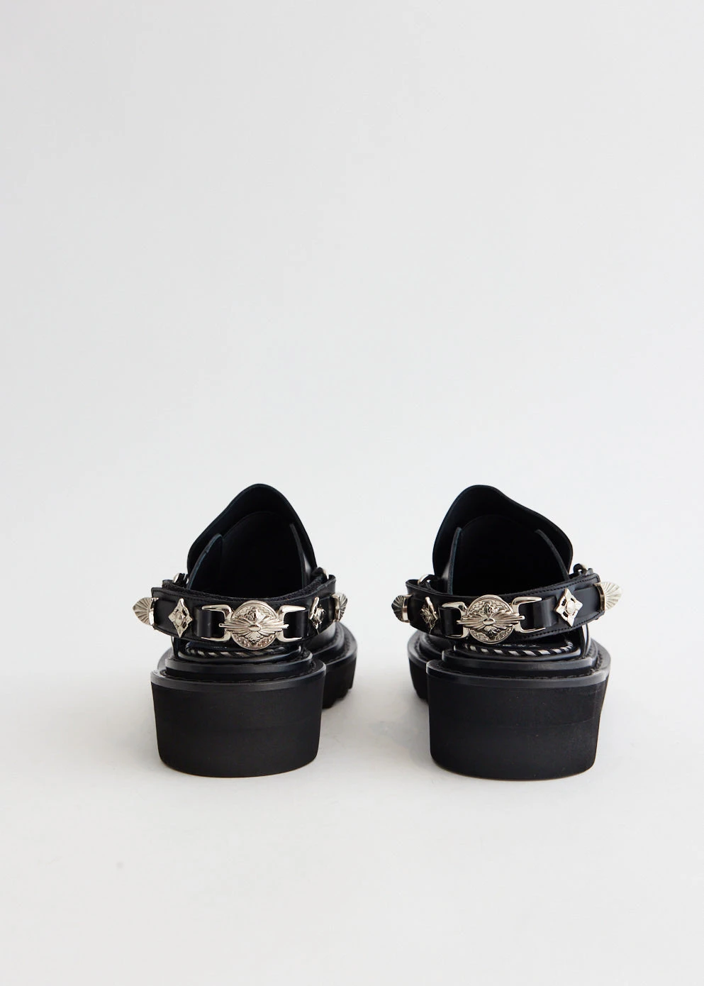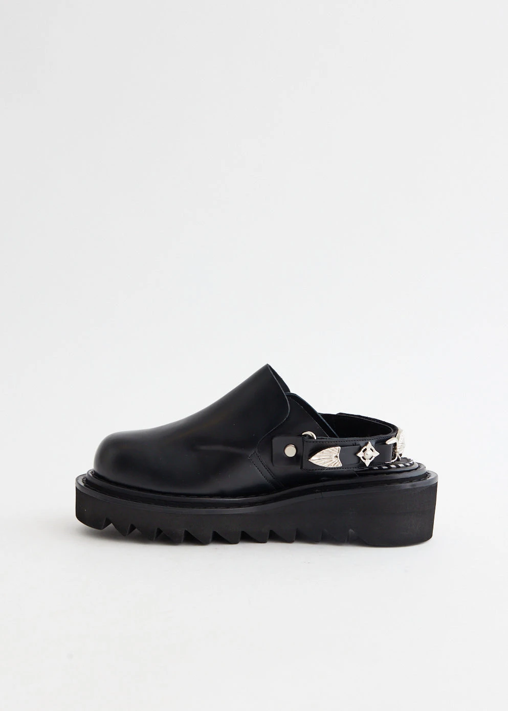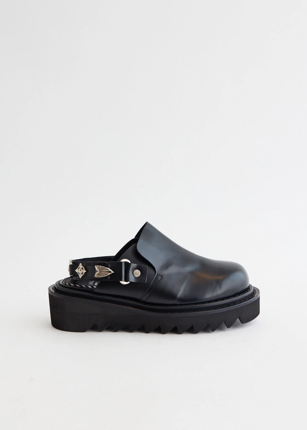 Yasuko Furuta’s menswear footwear line Toga Virilis was launched with the vision of showcasing the label’s skilfulness in craftsmanship, and has subsequently unveiled the their womenswear range, Toga Pulla. Traditional silhouettes are updated with Western flair and vintage verve as derby shoes and loafers are detailed with textured panels, cutout details and statement hardware. Made with a smooth leather upper, the AJ1239 Chunky Mules features a silver-stone hardware embellished ankle-strap and sits atop a chunky rubber sole.Â