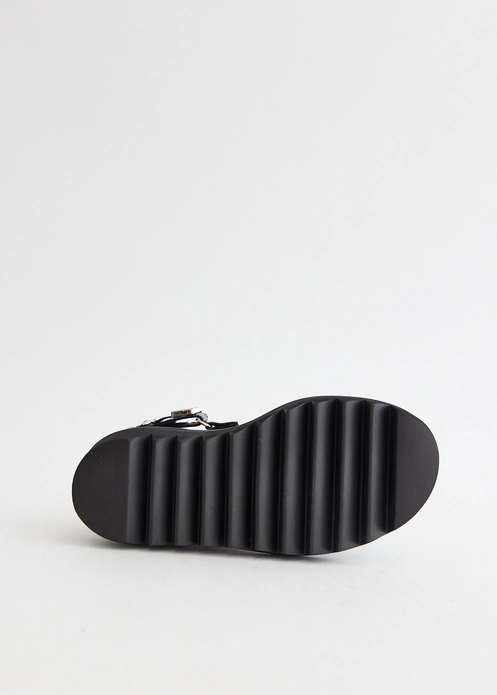 – Silver-tone hardware embellishments on buckled ankle-strap