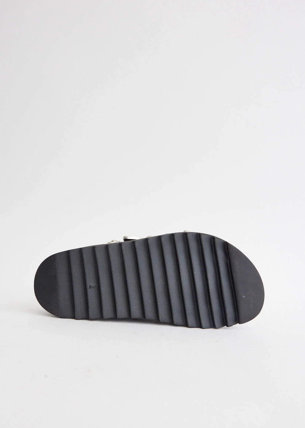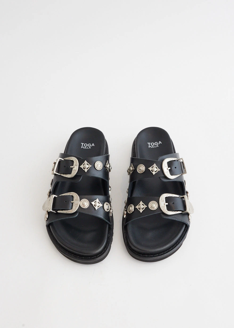 Yasuko Furuta’s menswear footwear line Toga Virilis was launched with the vision of showcasing the label’s skilfulness in craftsmanship, and has subsequently unveiled the their womenswear range, Toga Pulla. Traditional silhouettes are updated with Western flair and vintage verve as derby shoes and loafers are detailed with textured panels, cutout details and statement hardware. The AJ844 Sandals have buffed leather uppers with silver-toned buckles on two straps across the vamp.