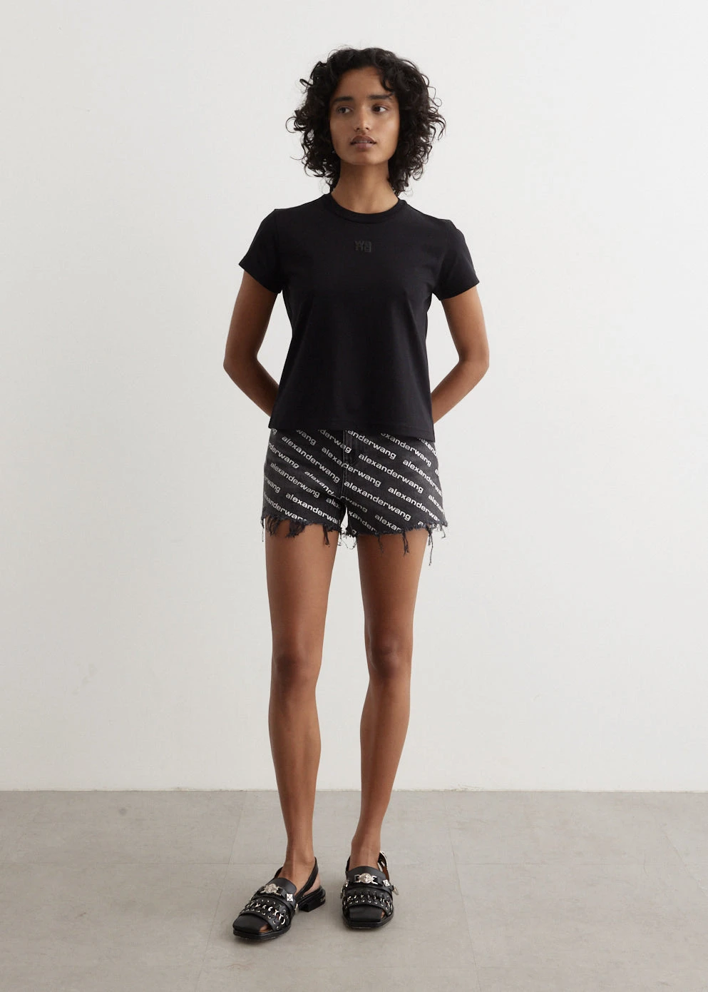 Embrace a laid-back vibe with off-duty styles from Alexander Wang’s latest collection. The beloved New York label spices up classic silhouettes with unexpected details and urban attitude. These distressed denim shorts with an allover logo print embody this persona perfectly. These shorts are designed to break in with wear, adopting a unique patina over time. They can be styled up or down, with sneakers or mules.