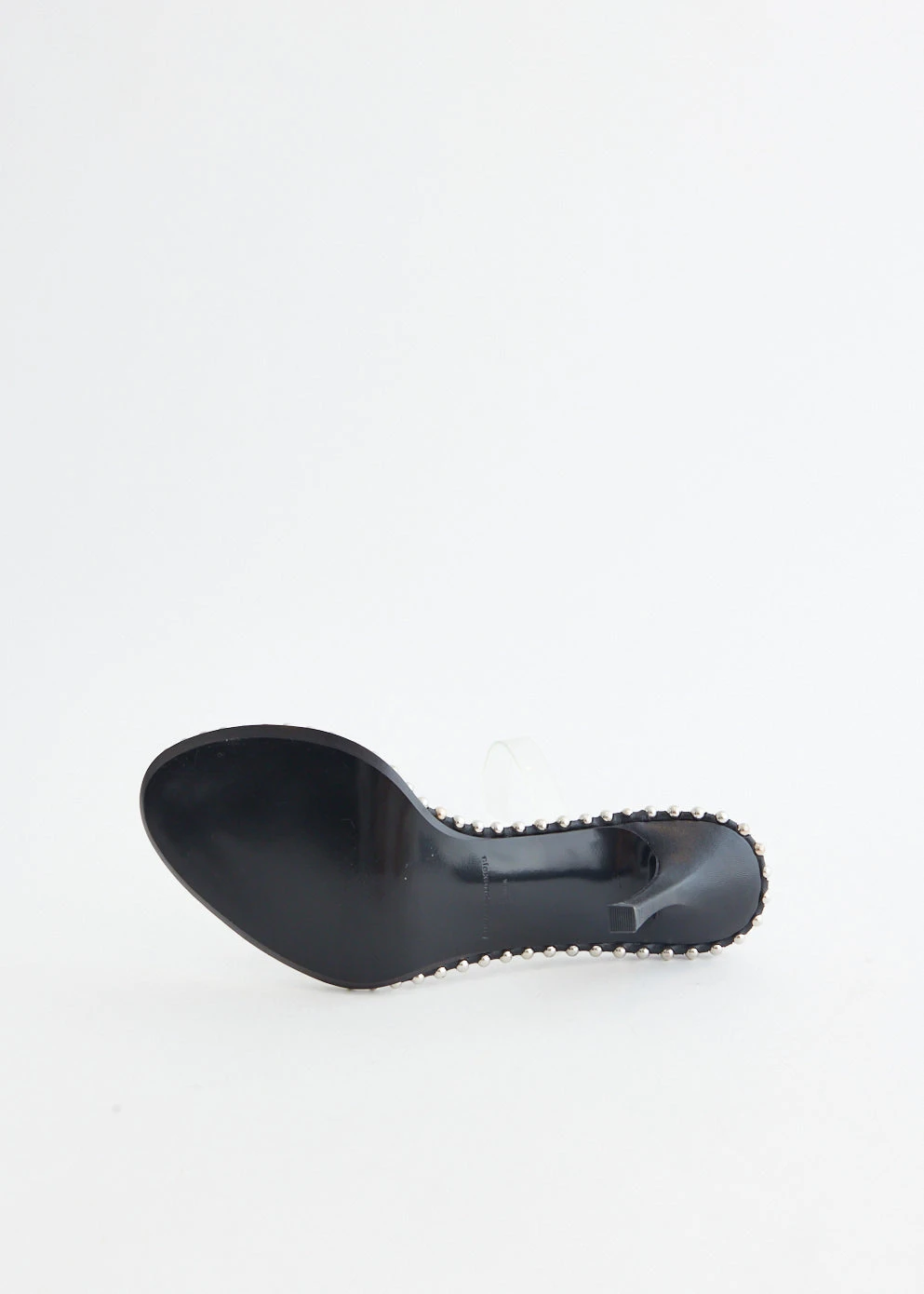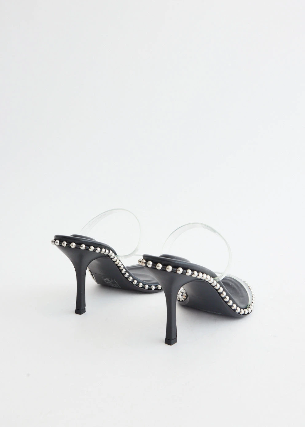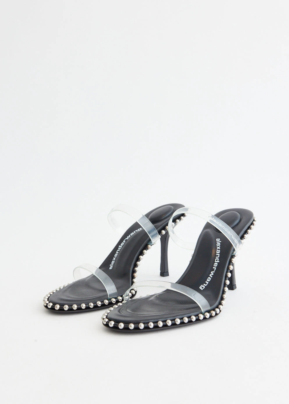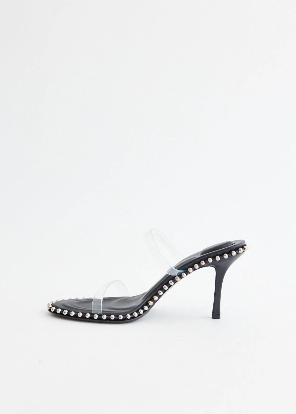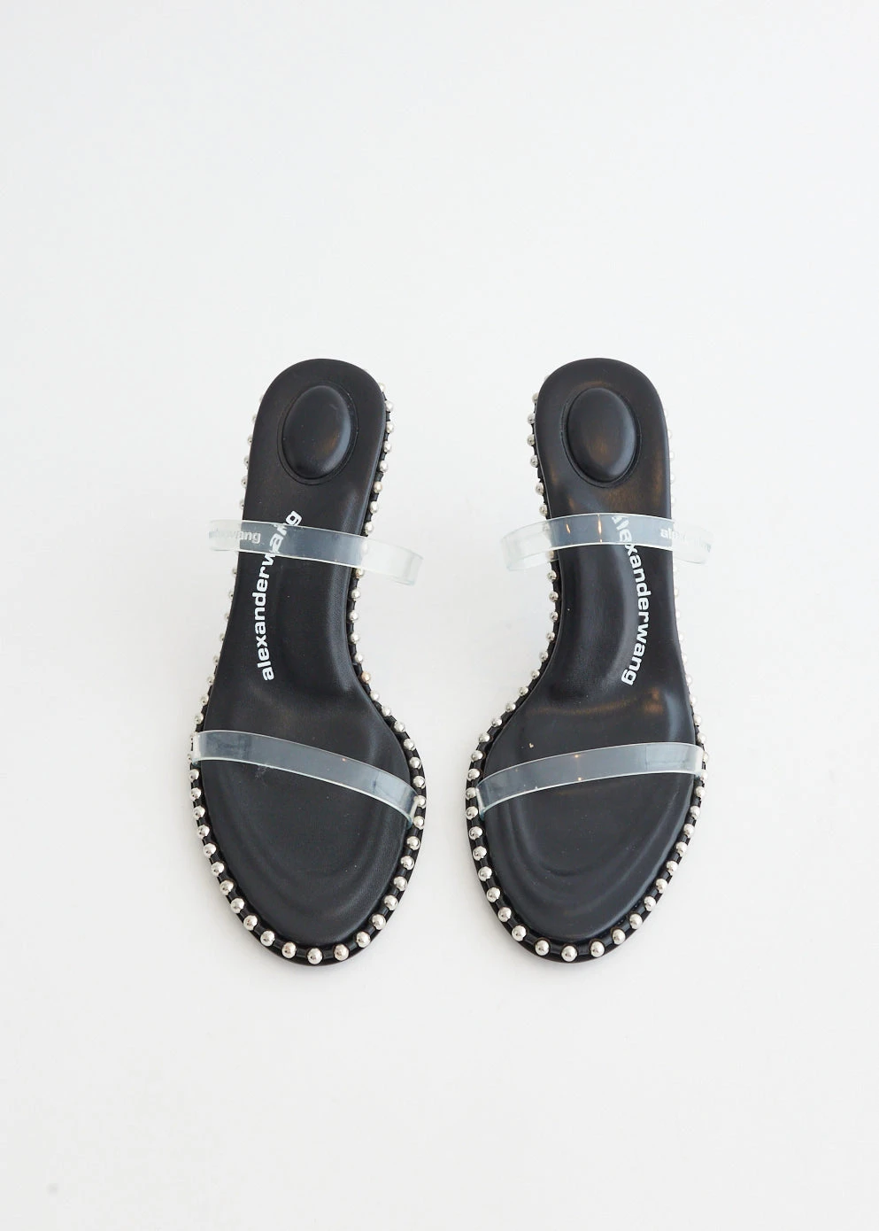 Embrace a laid-back vibe with off-duty styles from Alexander Wang’s latest collection. The beloved New York label spices up classic silhouettes with unexpected details and urban attitude. Crafted from calf leather, the Nova 85 Slide Sandals features an open almond toe, with transparent straps. Adorned with a moulded footbed, and silver-tone stud embellishments.Â