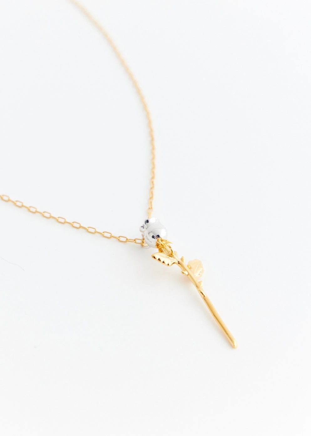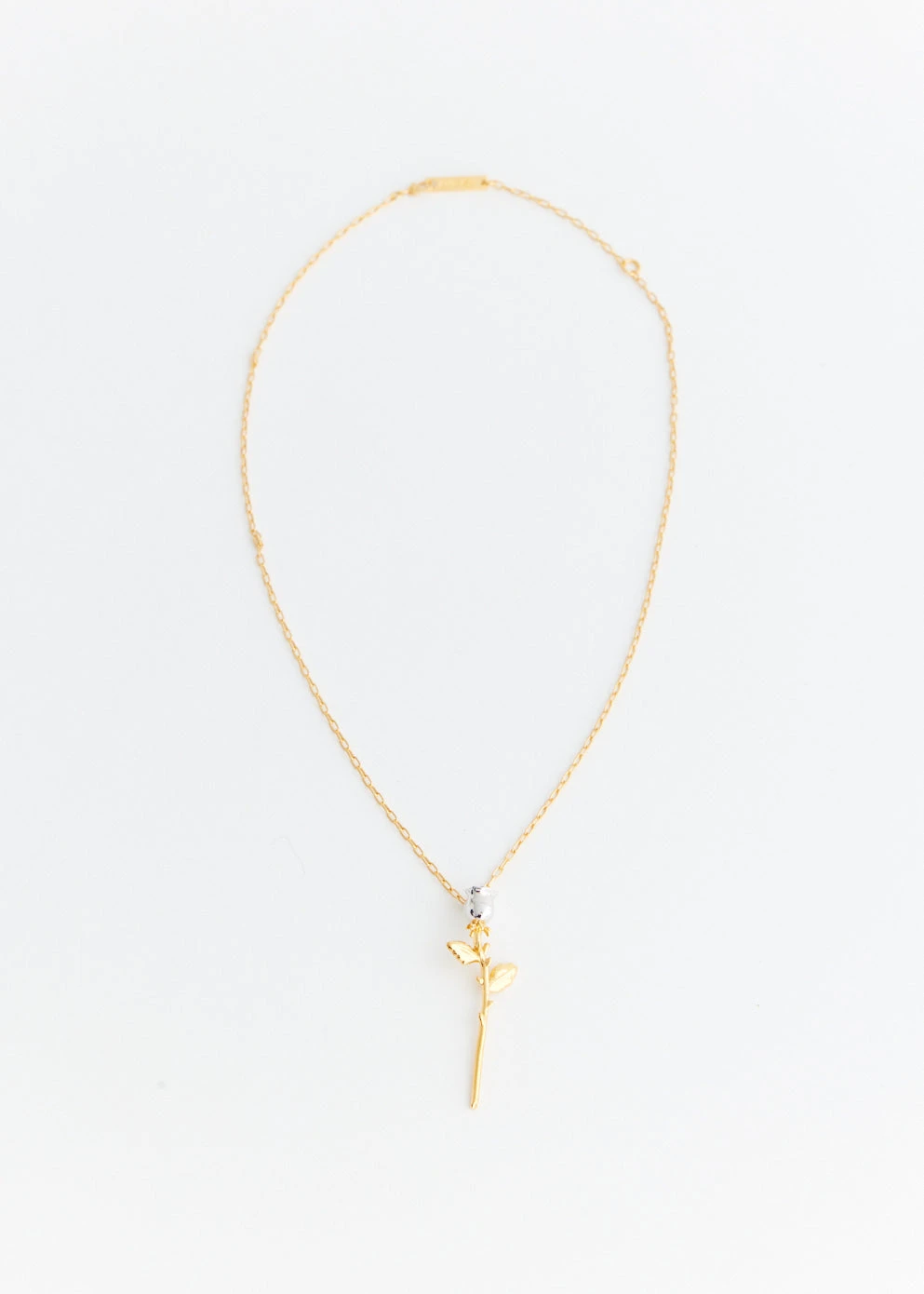 Mixing aesthetics of sub-cultures from around the world, luxury-streetwear brand AMBUSH doesn’t shy away from abstract references. Extending into jewellery, the brand’s head designers and power couple Yoon and Verbal blend surrealism with classic silhouettes. The Rose Charm Necklace features a silver coated brass pendant on an adjustable silver chain.