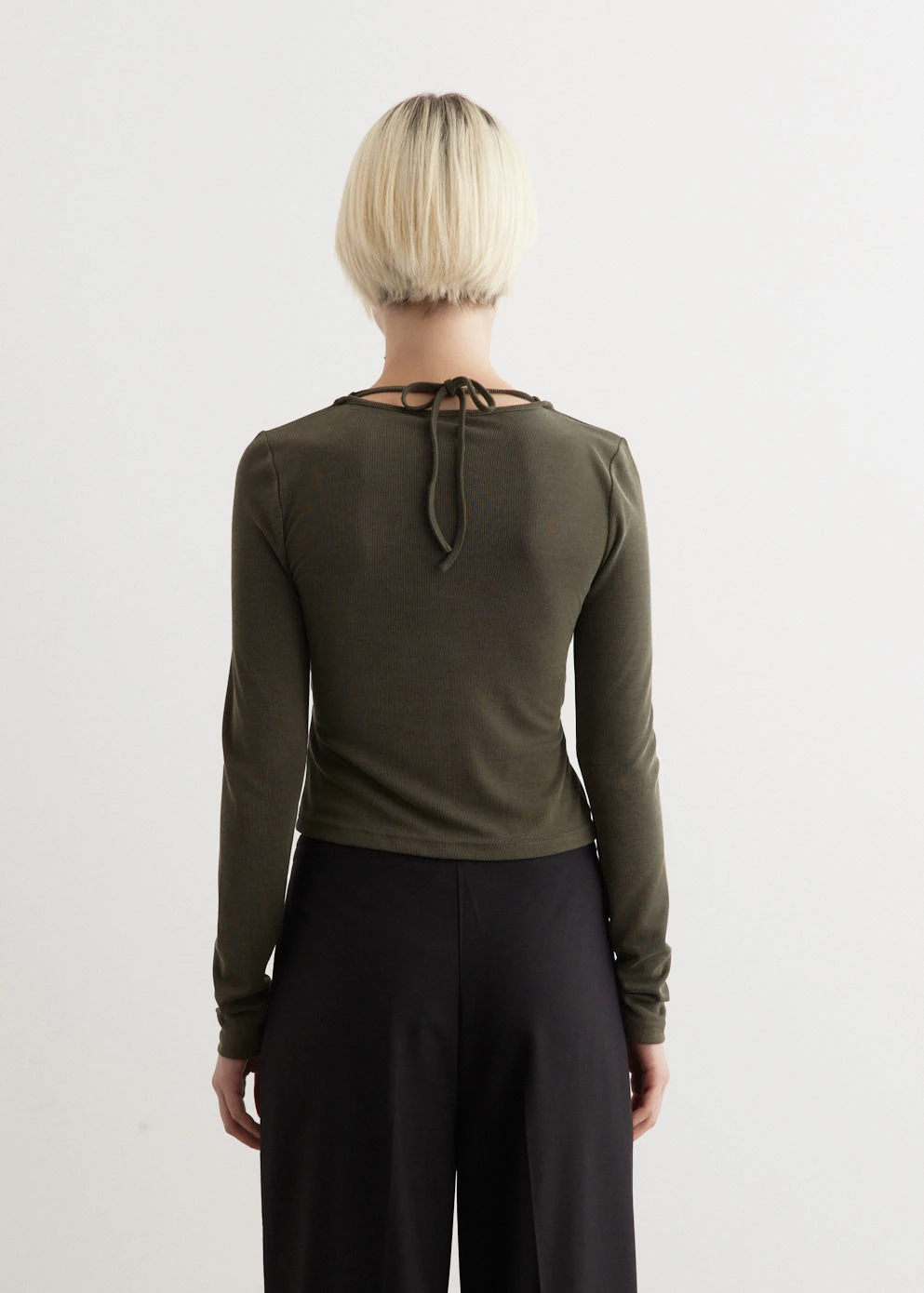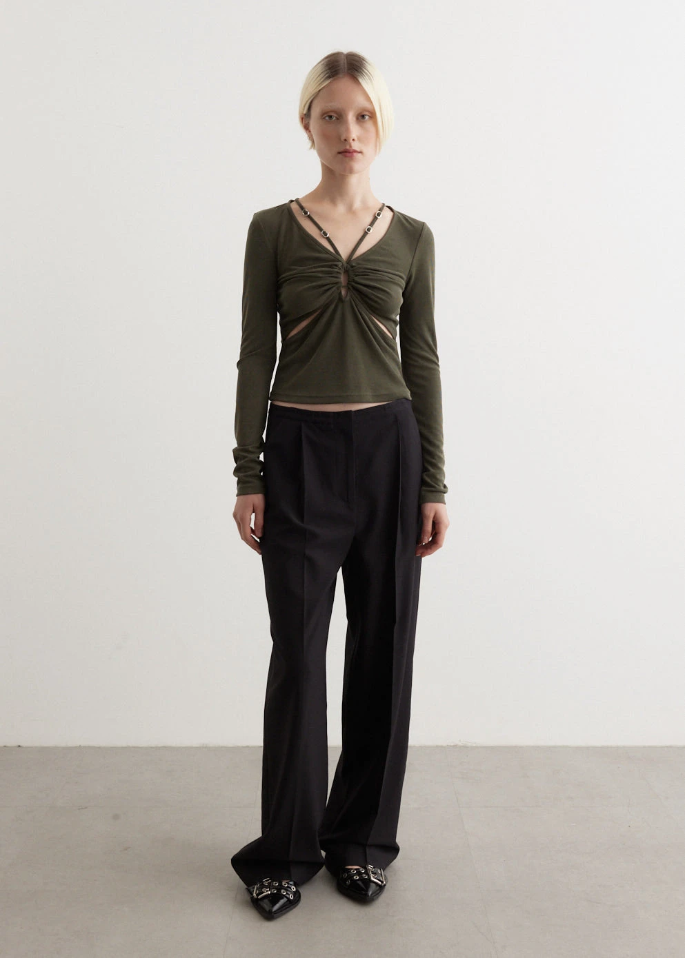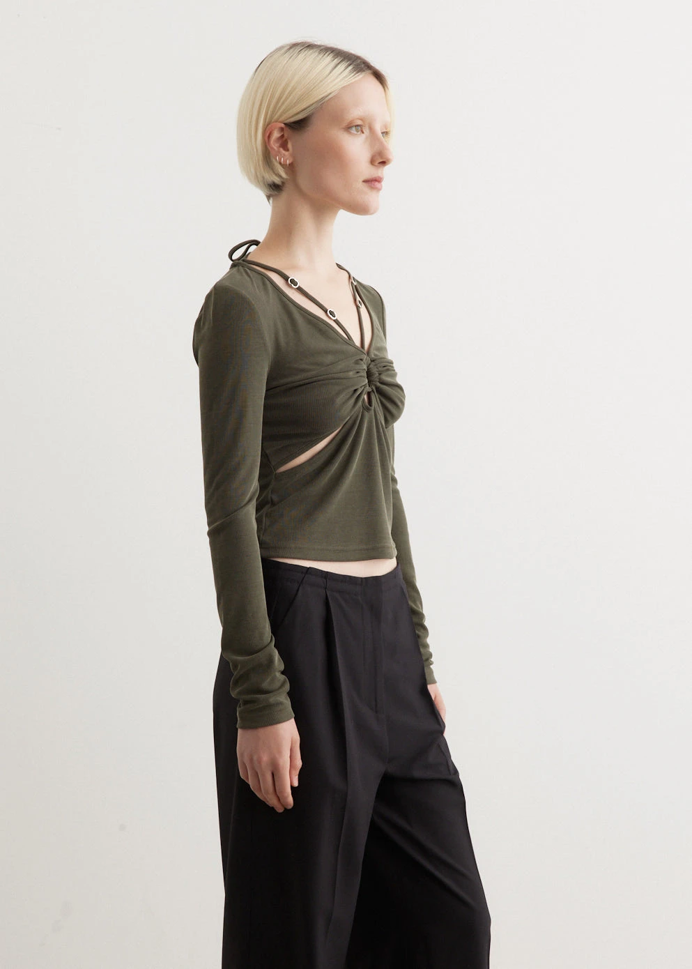 Incu Collection seamlessly blends vintage and contemporary elements, offering modernised 90s tailoring and elevated prints with photographic and abstract imagery. Made from a modal blend fabric with a textured ribbed design, the Amuse Cut Out Top a unique cut-out pattern on the front and is complemented by a v-neckline with metal trim embellishments.Â