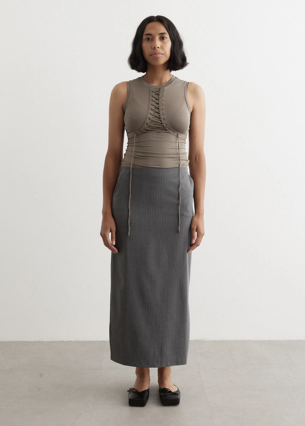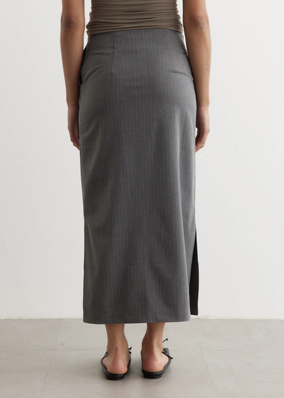 Incu Collection welcomes their Spring/Summer 2023-2024 collection, drawing inspiration from late 90’s grunge for a nostalgic feel, enhanced by contemporary sculpture influences. It offers a versatile summer wardrobe, blending elevated and casual styles. The Angel Long Pinstripe Skirt is cut to a midi-length and is detailed with a slit on the side for added style and ease of movement.