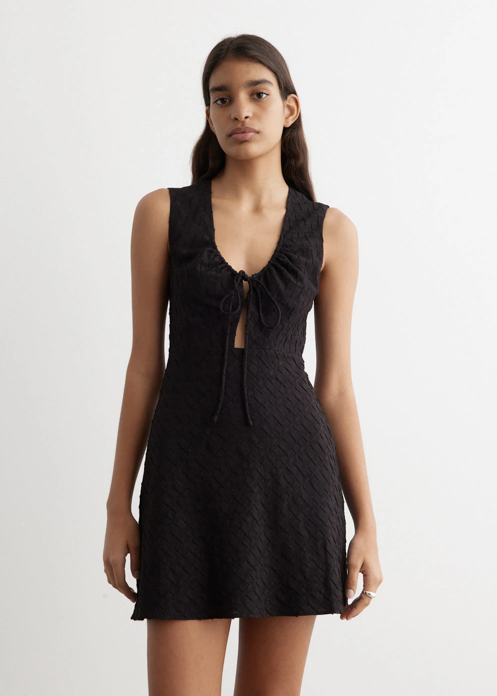 Incu Collection welcomes their Spring Summer 2023-2024 collection, drawing inspiration from the lasting influence of late 90’s grunge to evoke nostalgia in an approachable manner. Perspectives from contemporary sculptors bring a new dimension to reimagining textiles and colours. Made from a viscose blend fabric with a texture finish, the Anthem Mini Dress boasts a scoop-neckline with front ties.Â