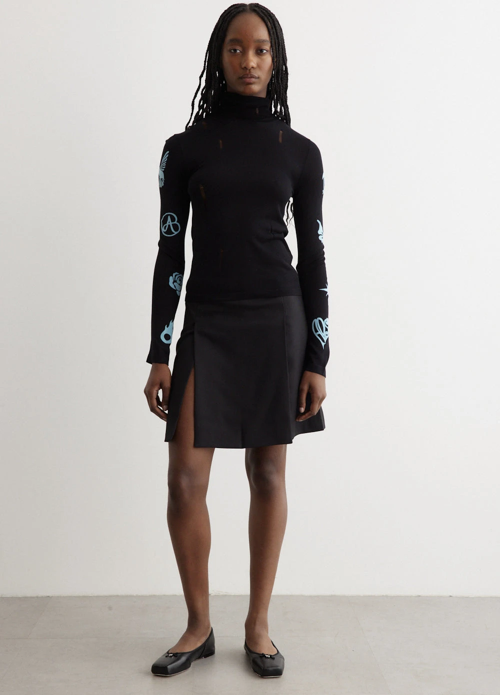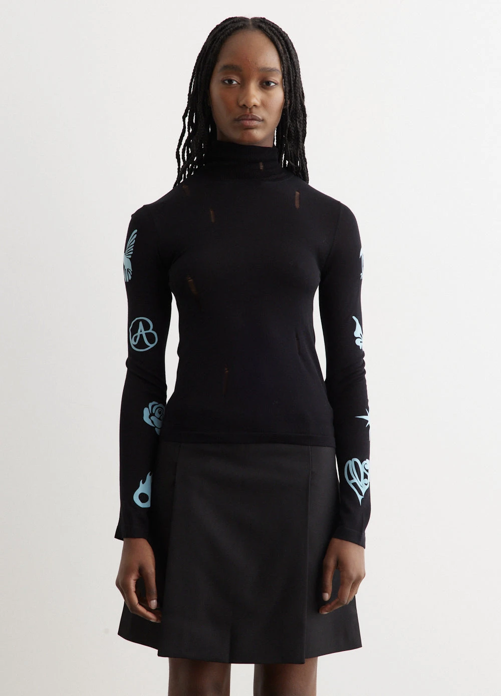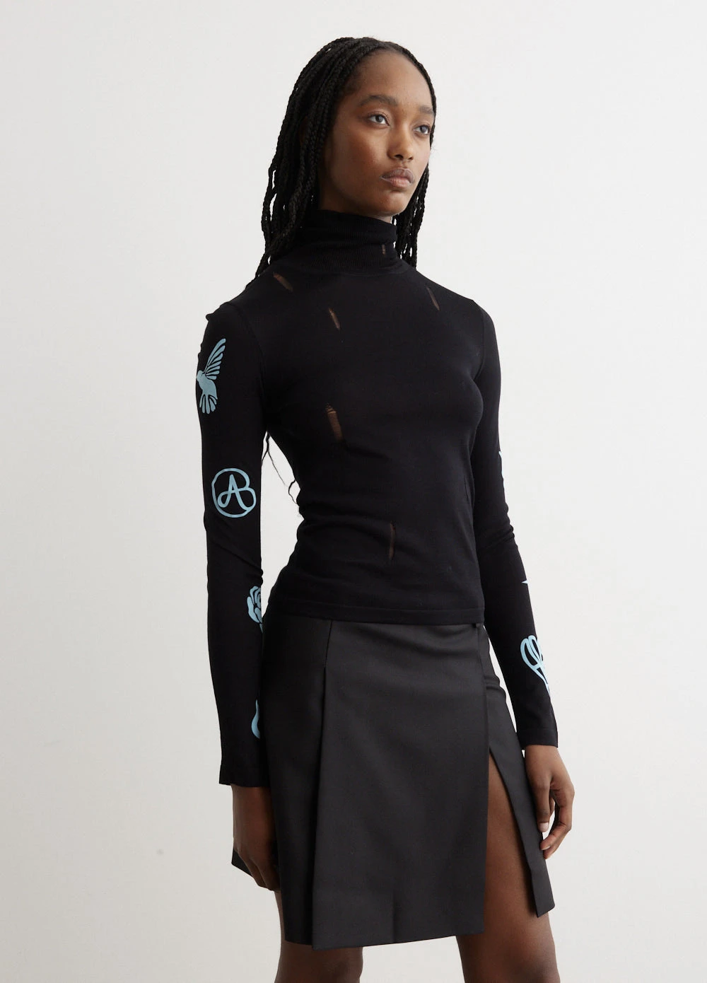 The identity of Andersson Bell was inspired by the merge of two contrasting cultures, reinterpreting Scandinavian aesthetic to create garments from a Korean perspective. Crafted from a viscose blend, the Augen Flocking Inner Knit Top is tailored to a slim fit. Adorned with a ribbed knit high collar, logo flag at side seam, and distressed detailing.