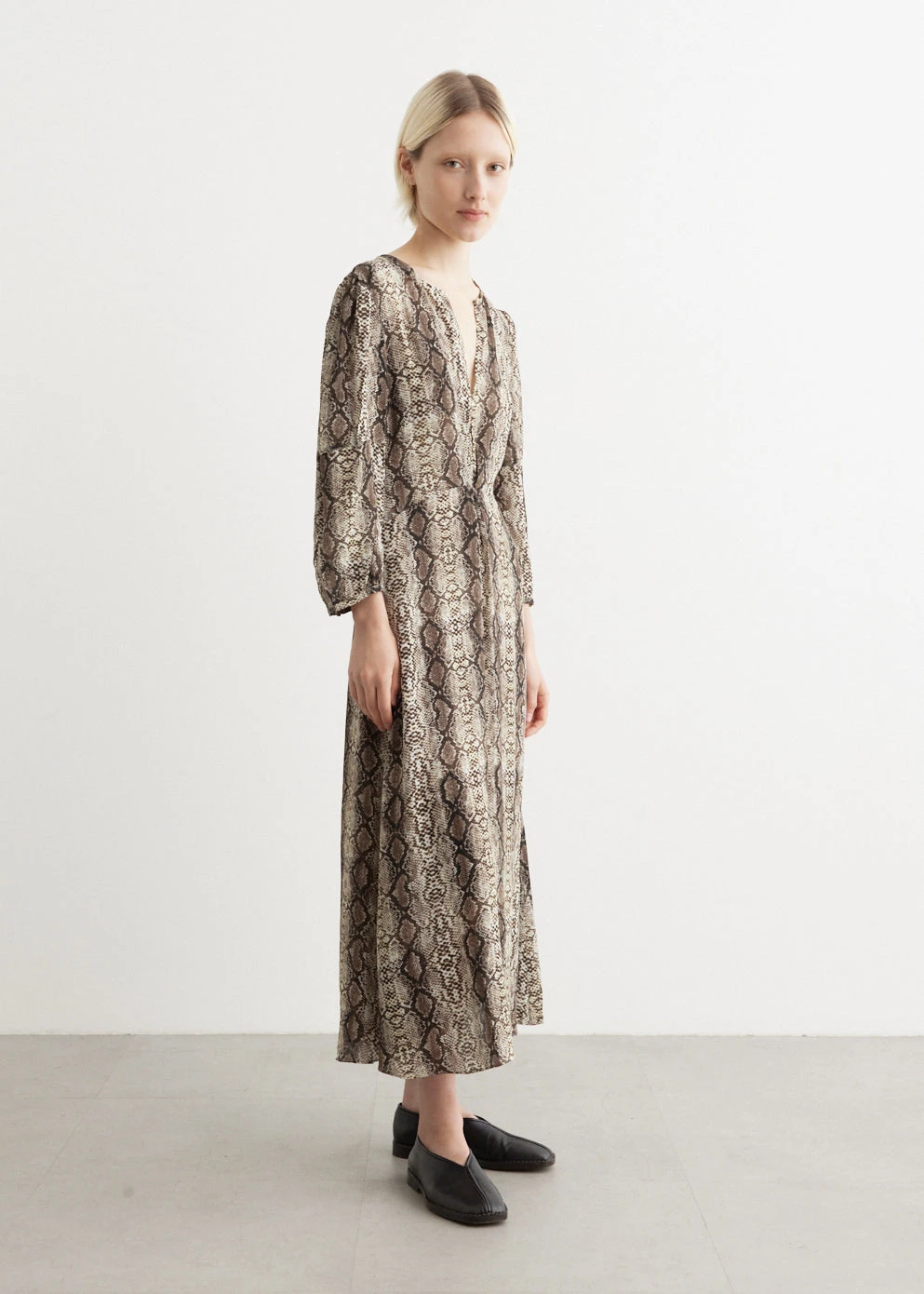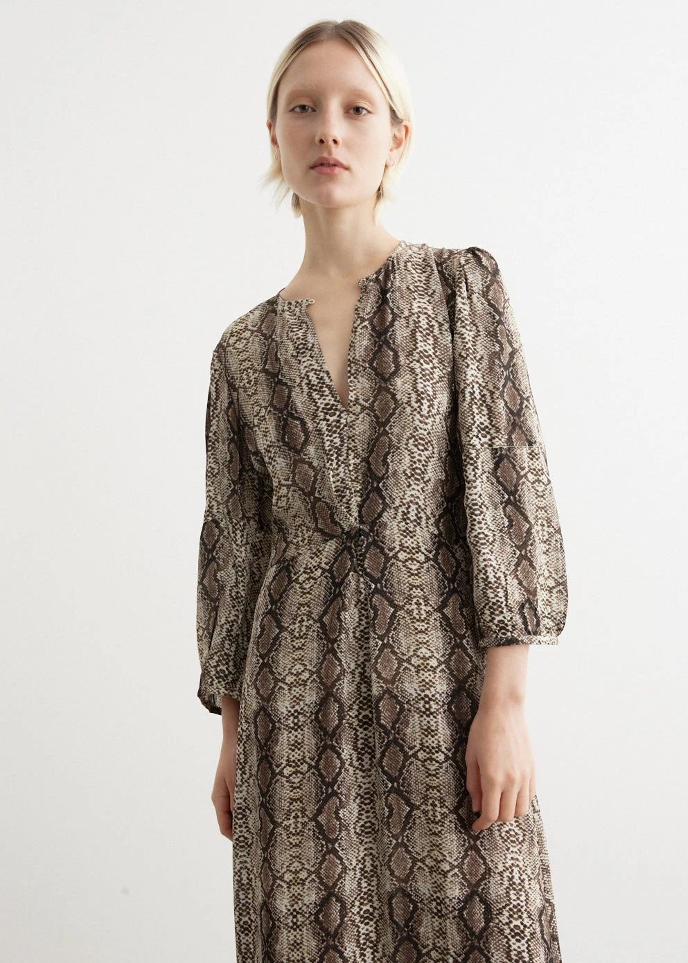 Brainchild of the designer duo Rikke Baumgarten and Helle Hestehave, Baum und Pferdgarten is the Danish label that blends modern feminine style with a playful sensibility. Crafted from a lightweight viscose-silk blend fabric, the Adya Dress is patterned with a bold snake print. Falling to a midi-length with a relaxed fit, it’s detailed with a key-hole detail at the front-centre, secured with a button closure.