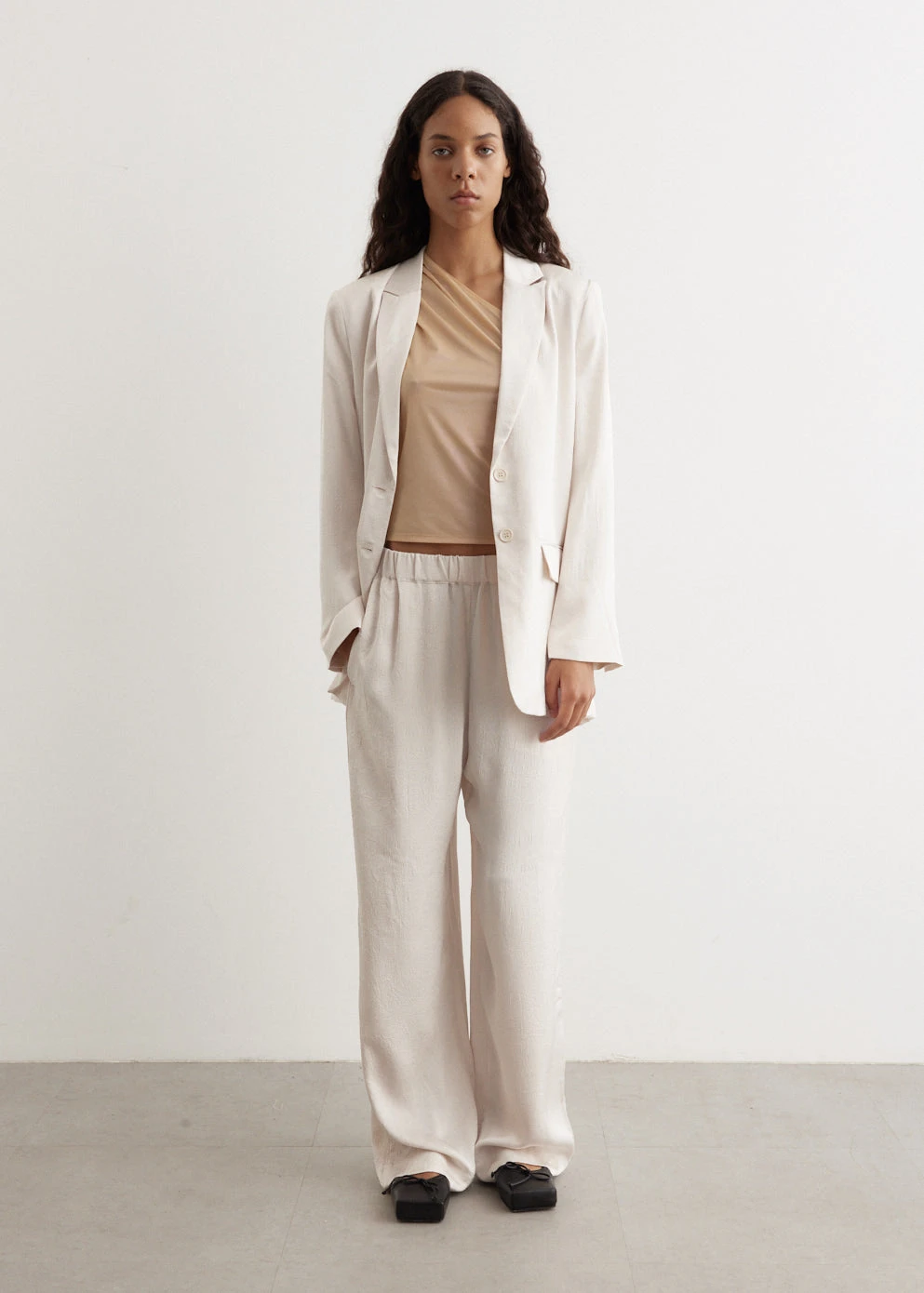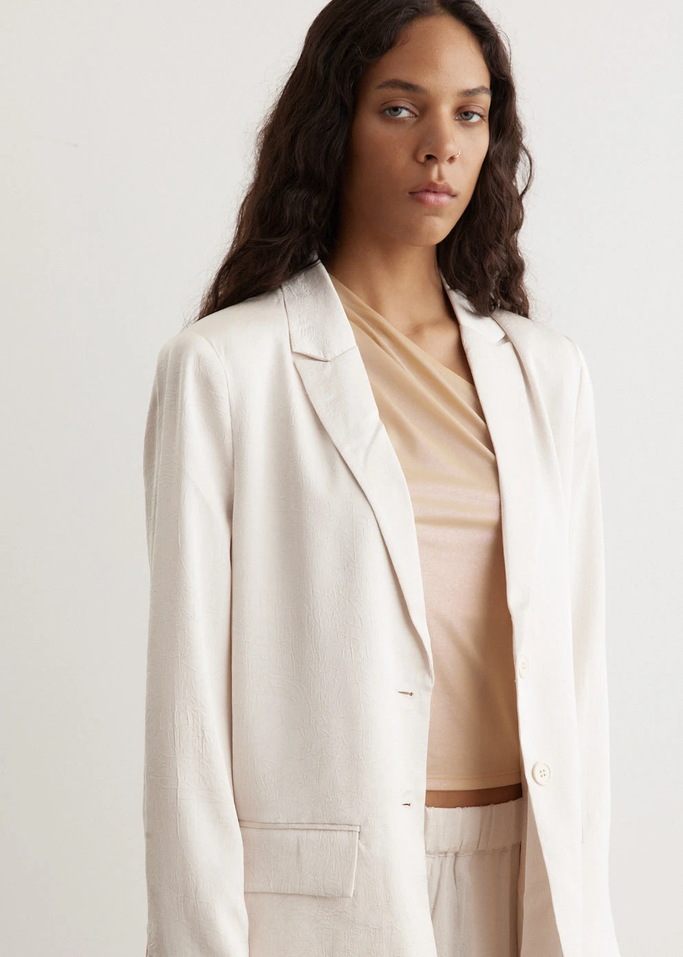 Brainchild of the designer duo Rikke Baumgarten and Helle Hestehave, Baum und Pferdgarten is the Danish label that blends modern feminine style with a playful sensibility. The Bertha Blazer is tailored to a loose, fluid fit. Adorned with an open neckline, with button closures at the front. Detailed with padded shoulders.