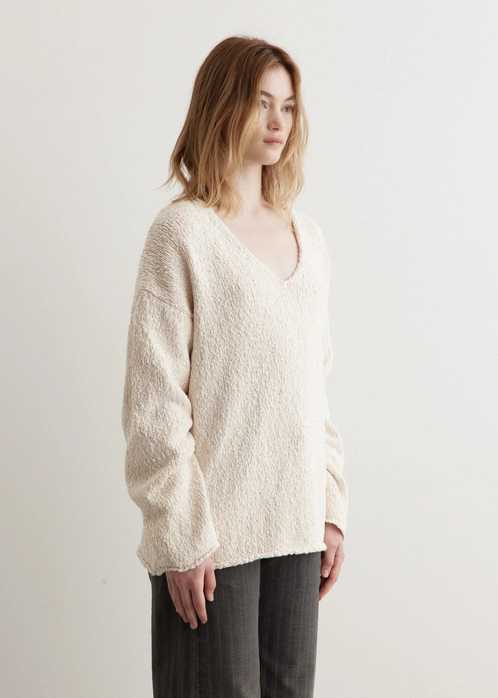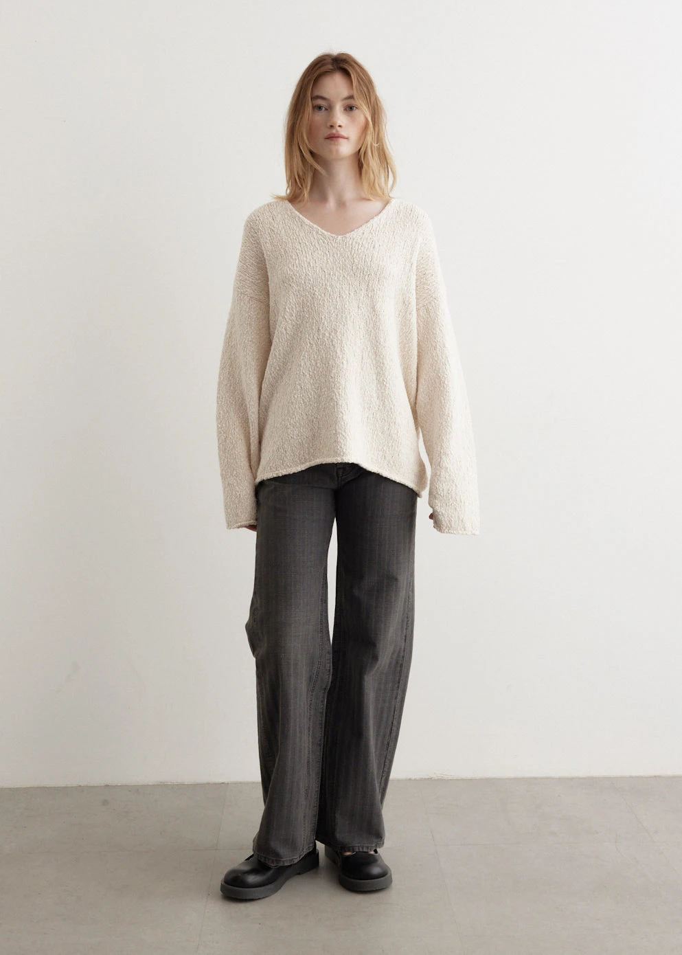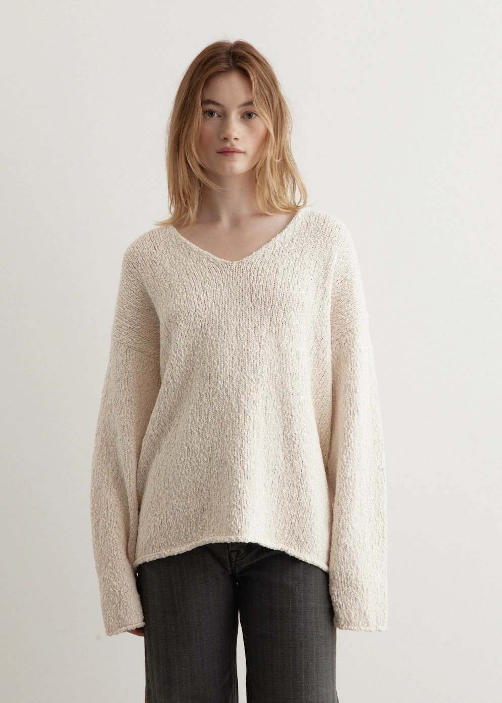 Róhe was birthed out of Amsterdam with particular attention on creating modern, timeless clothing that transcends seasons. Crafted with knitted boucle cotton yarn, the Boucle Knitted V-Neck Sweater is cut to a relaxed fit and is framed by its v-neckline.