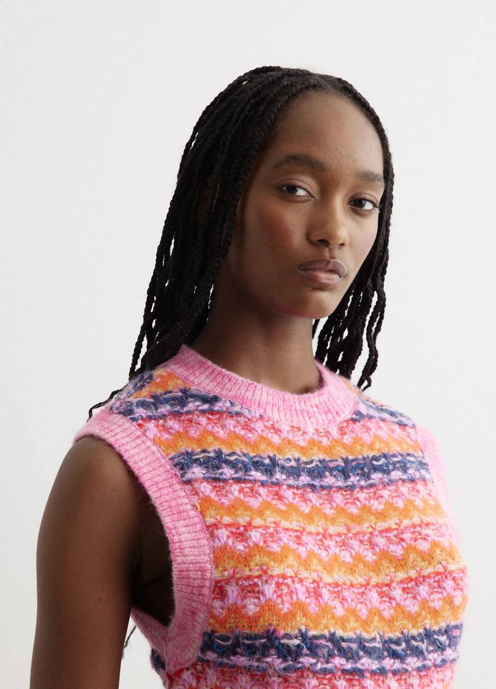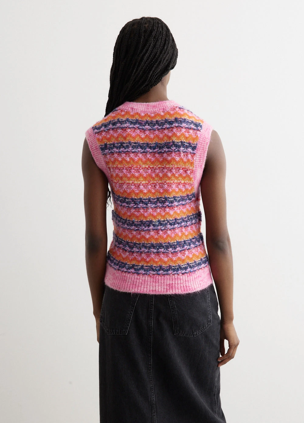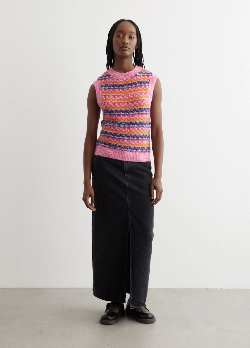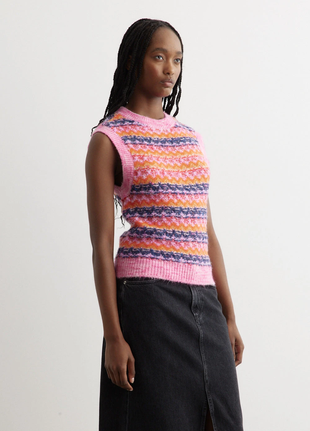 The identity of Andersson Bell was inspired by the merge of two contrasting cultures, reinterpreting Scandinavian aesthetic to create garments from a Korean perspective. Crafted from a soft wool blend, the Candy Crew-Neck Vest is tailored to a semi-cropped, slim fit. Adorned with a ribbed trimming, round neckline and an all-over pattern.