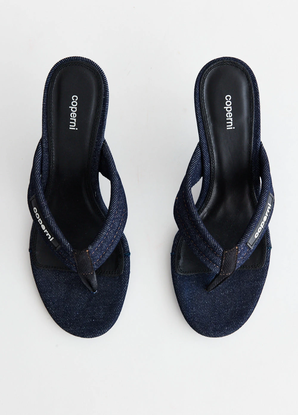 Coperni was established in Paris in 2013 by Sébastien Meyer and Arnaud Vaillant. The brand’s sleek version of minimalism is heavily influenced by the digital age, with a particular focus on asymmetry and structure. Minimal and stylish, the Denim Branded Thong Sandals are a slip-on style with a metal mid-heel. Featuring a logo patch, this sandal offers a sophisticated branded finish.