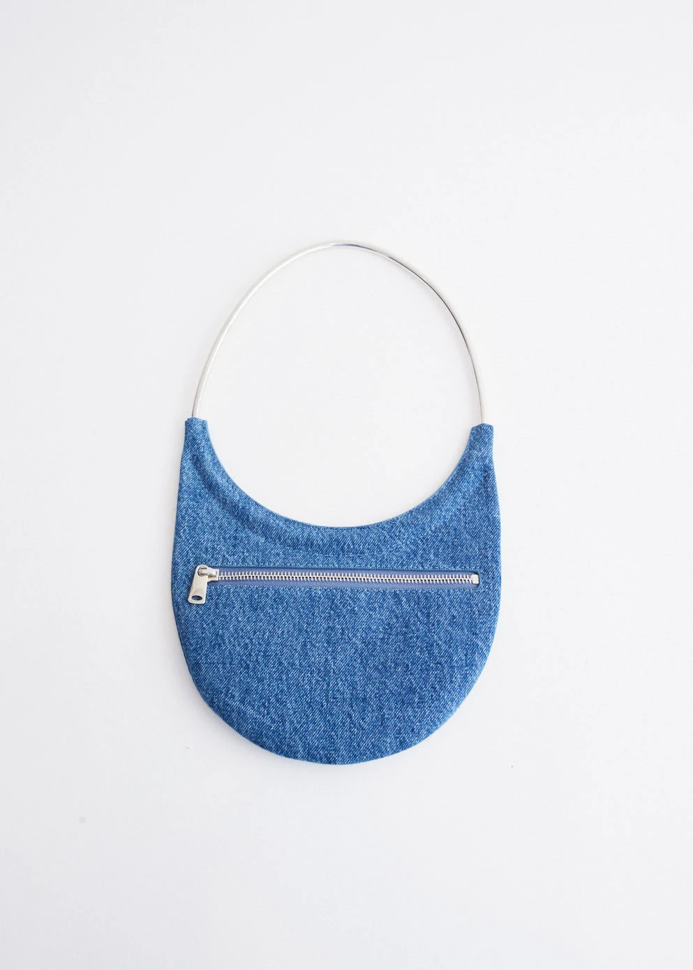 Coperni was established in Paris in 2013 by Sébastien Meyer and Arnaud Vaillant. The brand’s sleek version of minimalism is heavily influenced by the digital age, with a particular focus on asymmetry and structure. This futuristic Denim Ring Swipe Bag features a cotton denim construction, and a curved metal handle and a small ‘C’ logo on the front.
