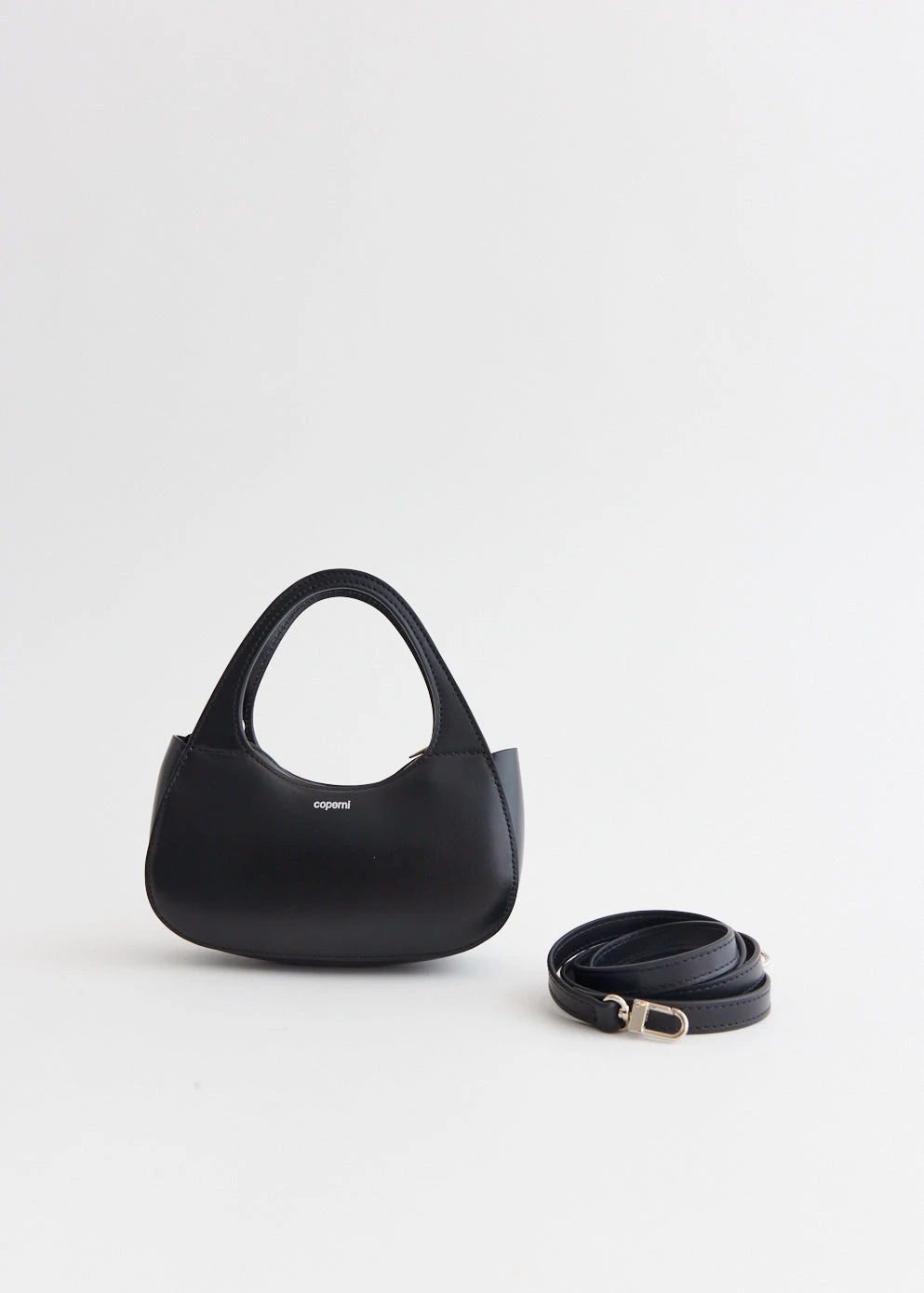 Coperni was established in Paris in 2013 by Sébastien Meyer and Arnaud Vaillant. The brands sleek version of minimalism is heavily influenced by the digital age, with a particular focus on asymmetry and structure. Part of the brand’s iconic Swipe Bag range, the Micro Baguette Swipe Bag is an elongated, baguette version of the classic Mini Swipe Bag. It is made from premium leather and features a structured handle and removable strap.