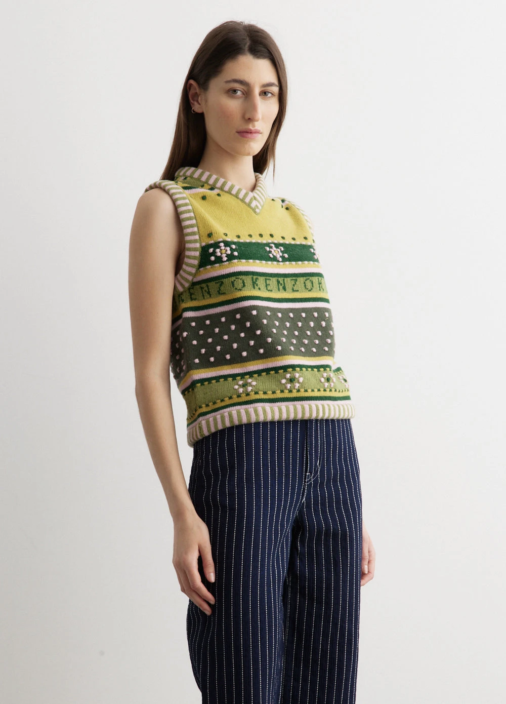 Founded in Paris in 1970 by Kenzo Takada, who was born in Japan and moved to Paris in 1964. The label is known for its Asian influence on traditional European designs, delivering borderless fashion that celebrates cultural diversity. Crafted from wool fabrication, the Fairisle Knitted Jumper Vest is tailored to a relaxed fit. Adorned with an all-over jacquard weave offers a burst of colour, polka dots.