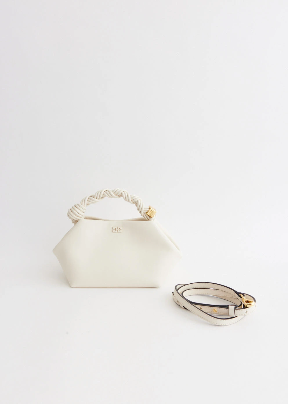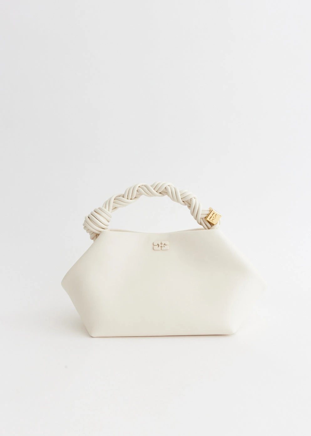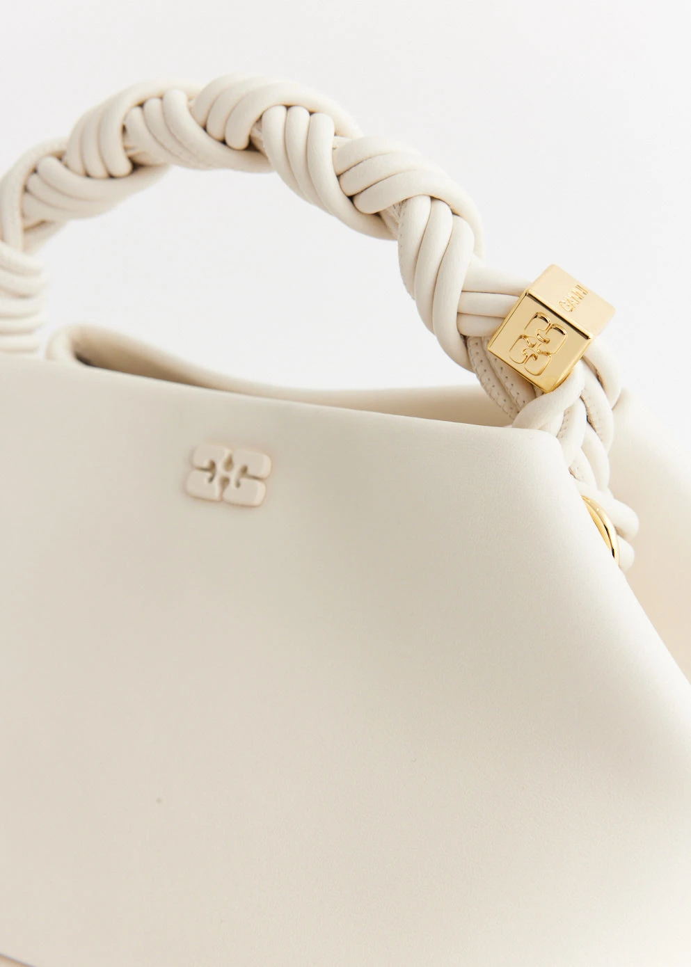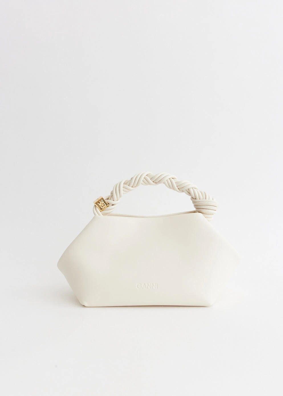 Danish label Ganni blends streetwear trends with a playful touch of humour through bold prints and colour palettes, voluminous silhouettes and easy-to-wear fabrics. The label introduces a chic new entry into the range, the Bou Bag. Crafted from recycled leather, it flaunts a hexagonal shape and hand-braided top handle. It’s detailed with a metallic dice engraved with a GANNI and Butterfly logo and is finished with a Butterfly logo charm at the front and embossed GANNI logo at the back.
