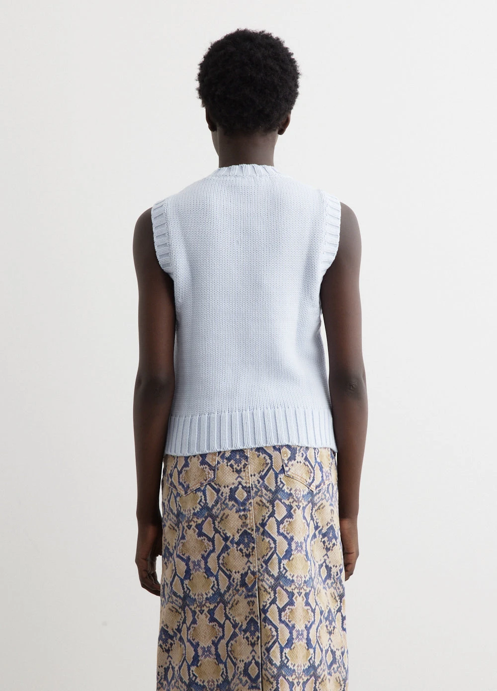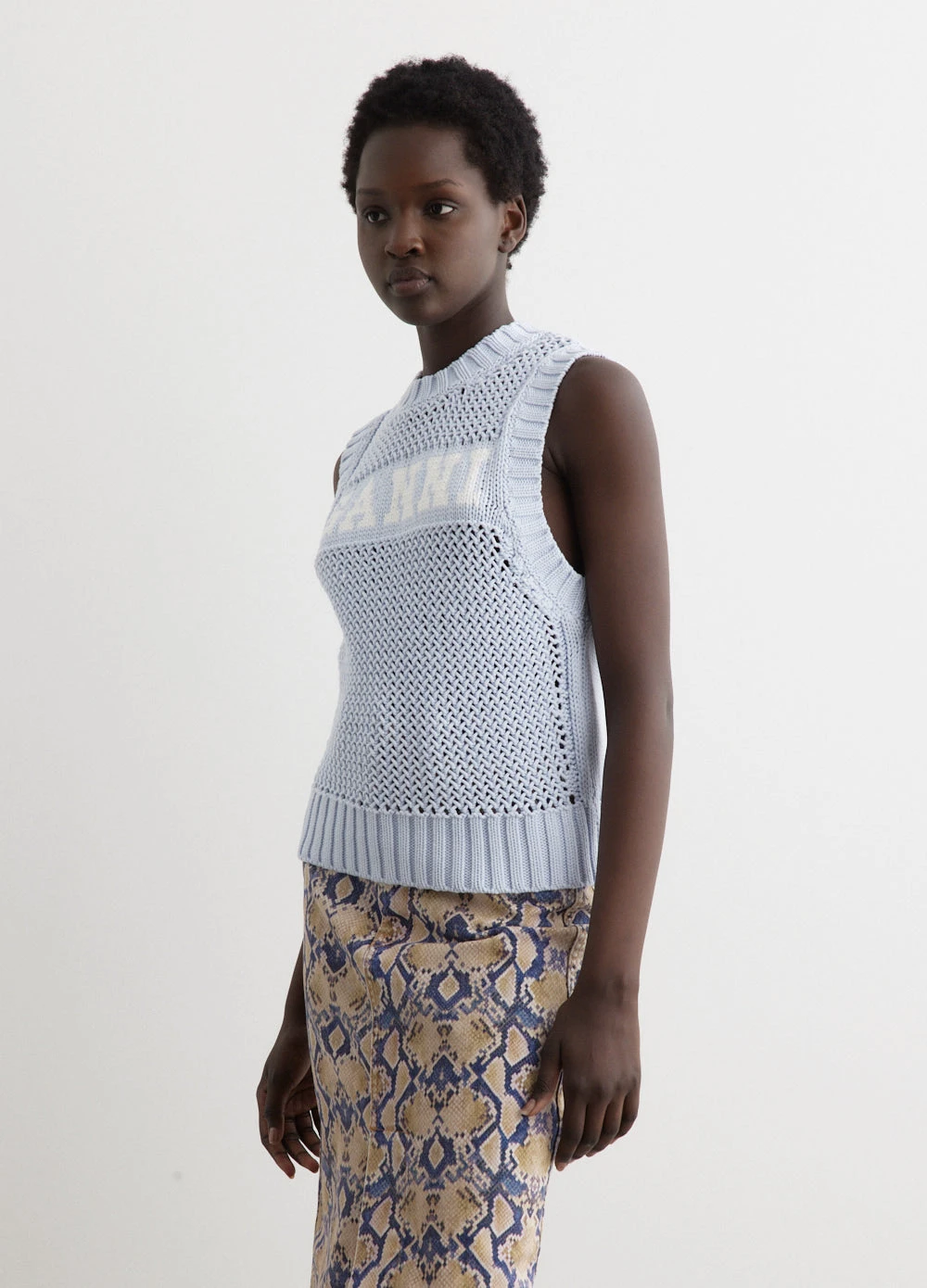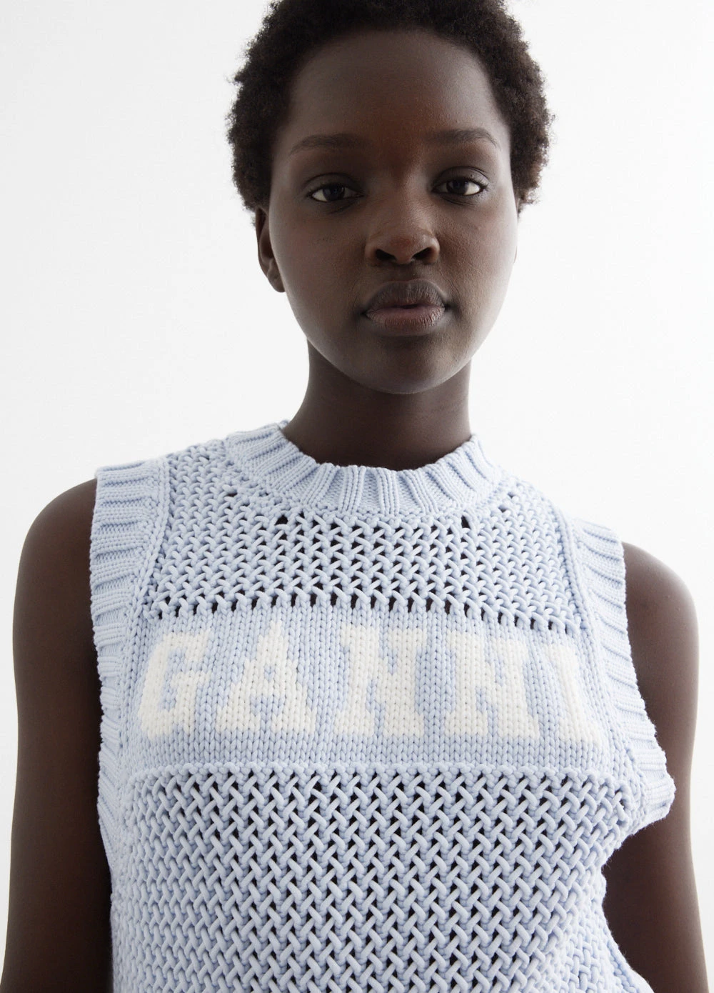 Danish label Ganni blends streetwear trends with a playful touch of humour through bold prints and colour palettes, voluminous silhouettes and easy-to-wear fabrics. Knitted from an organic cotton blend fabric, the Cotton Rope Vest boasts a contrasting woven logo on the front.