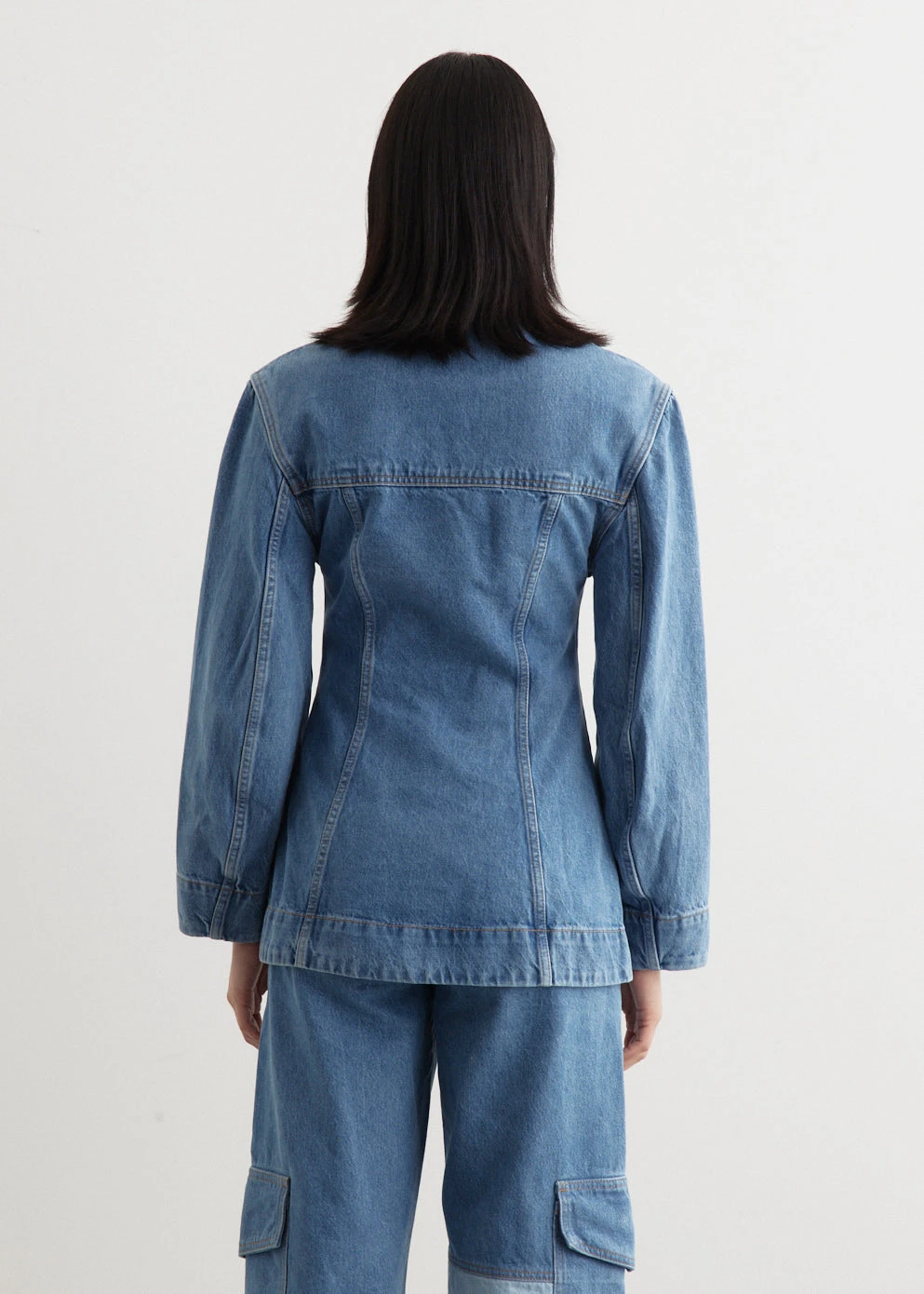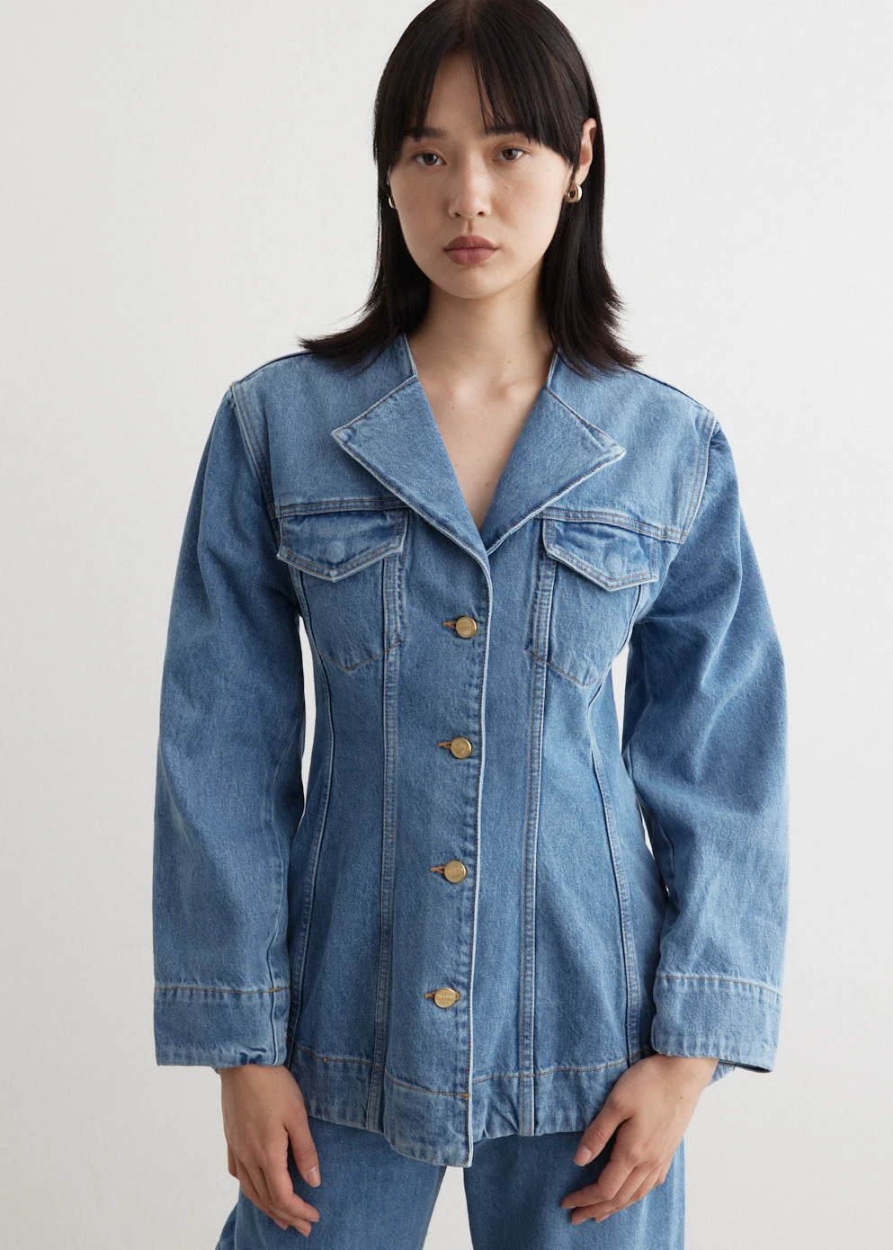 Danish label Ganni blends streetwear trends with a playful touch of humour through bold prints and colour palettes, voluminous silhouettes and easy-to-wear fabrics. Crafted from cotton denim, the Cutline Denim Fitted Blazer is infused with a modern take on a timeless silhouette, boasting exaggerated shoulders and a cinched-in waistline.