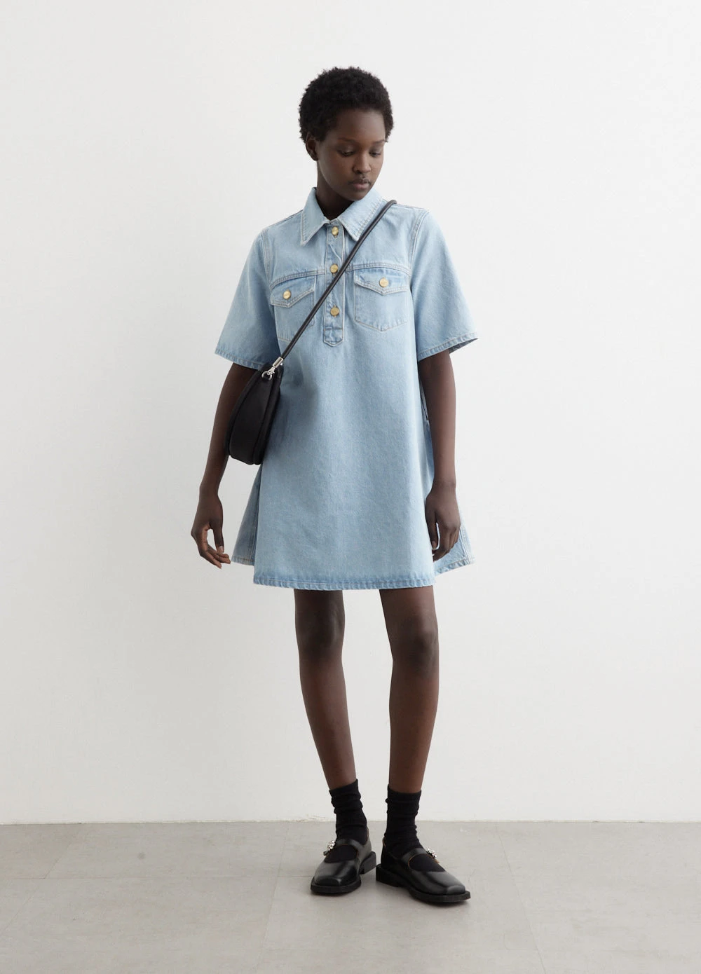 Danish label Ganni blends streetwear trends with a playful touch of humour through bold prints and colour palettes, voluminous silhouettes and easy-to-wear fabrics. The Cutline Denim Mini Dress is crafted from an organic cotton denim. Designed for a regular fit.