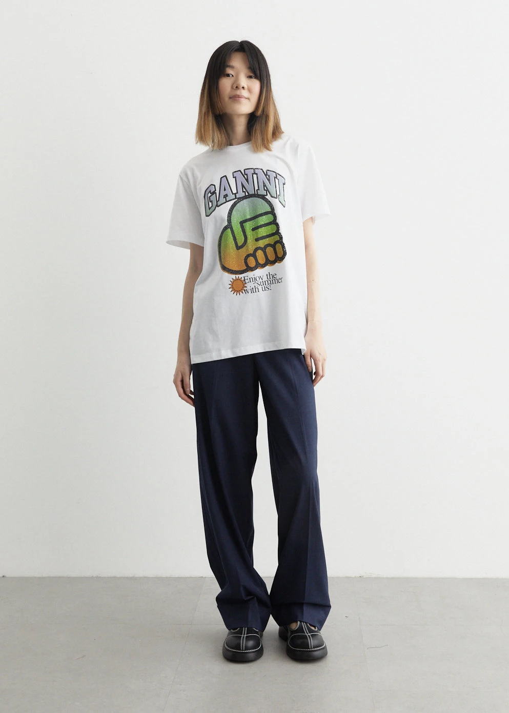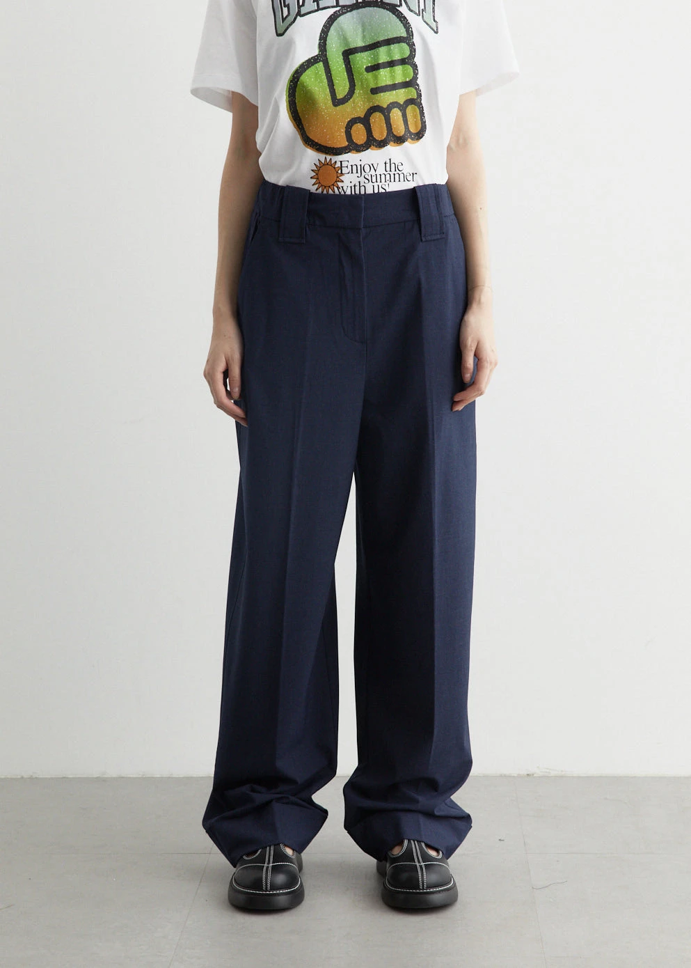 Danish label Ganni blends streetwear trends with a playful touch of humour through bold prints and colour palettes, voluminous silhouettes and easy-to-wear fabrics. Made from a viscose blend fabric, the Drapey Melange High Waist Pants are designed with a relaxed, wide leg and sit high at the waist.Â