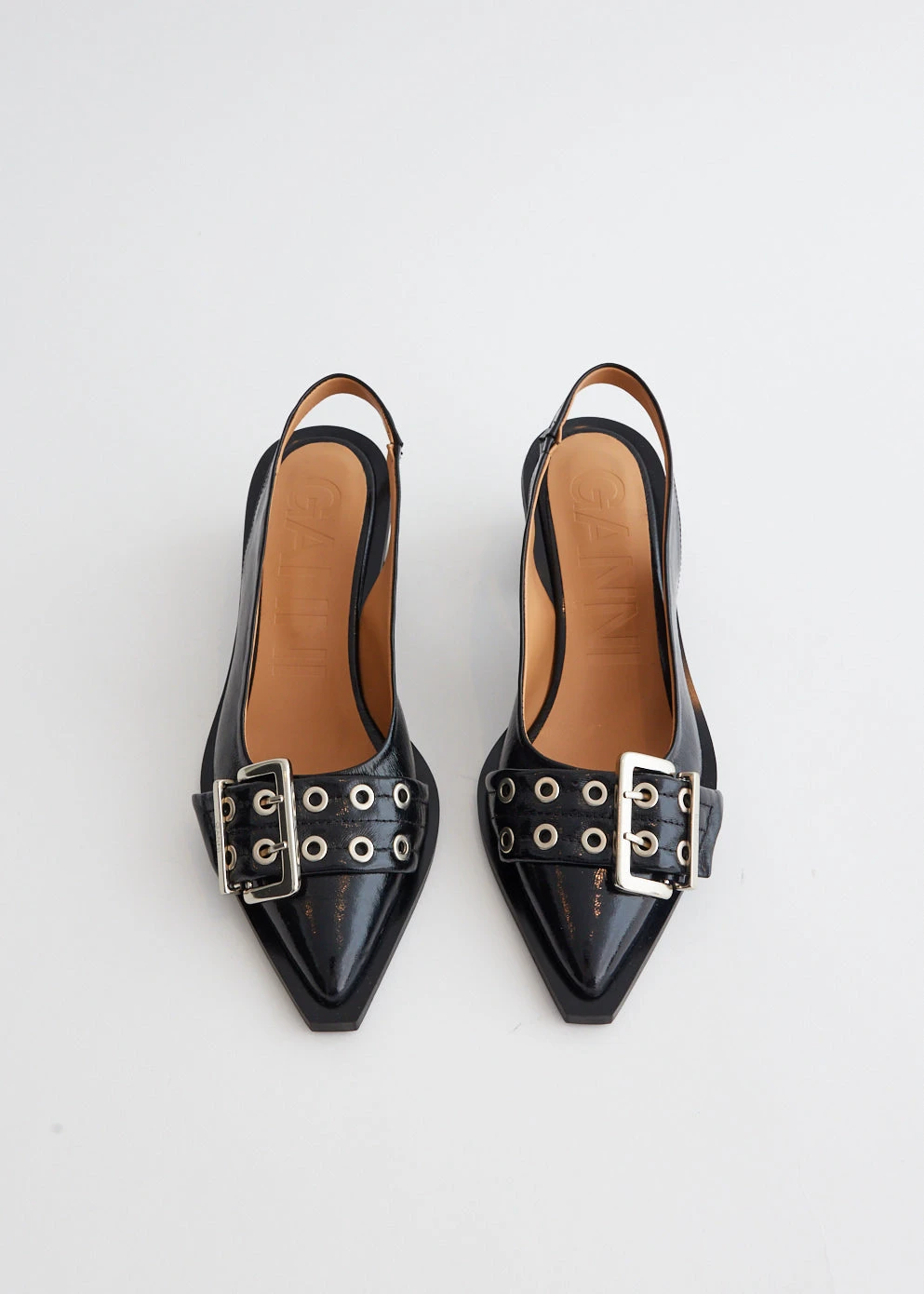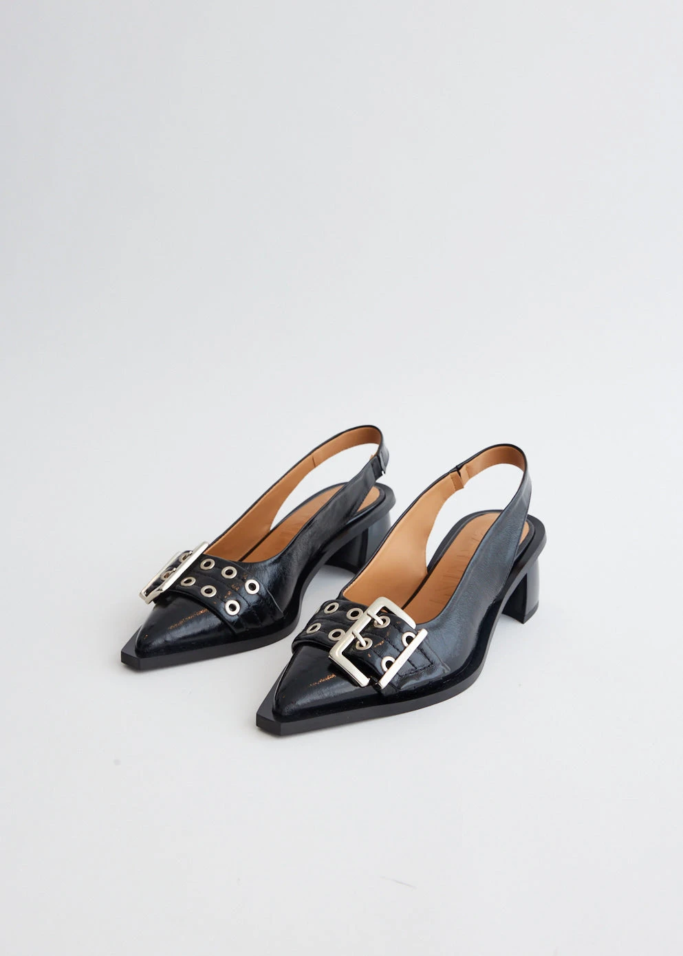 Danish label Ganni blends streetwear trends with a playful touch of humour through bold prints and colour palettes, voluminous silhouettes and easy-to-wear fabrics. Made from naplack leather, the Feminine Buckle Slingback Pumps are designed with a pointed toe and feature a large metal buckle.