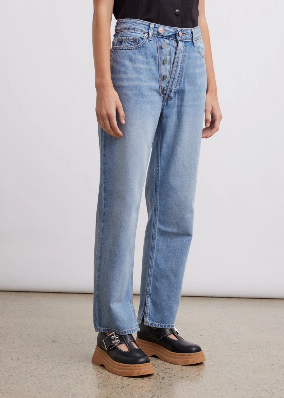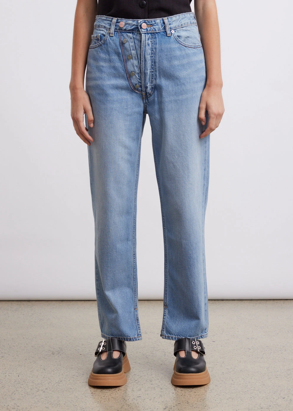 The Figny Rigid Denim Jeans are a modern high-rise style with Ganni’s characteristic fun touch. As part of the label’s responsible initiative, Ganni uses organic cotton denim, which is mid-weight and non-stretchy, lending itself to a relaxed silhouette. With the double fly feature, customise your look and wear it as a low rise fit or slightly higher on the waist. Pair it with tailoring from the label for a modern casual look.