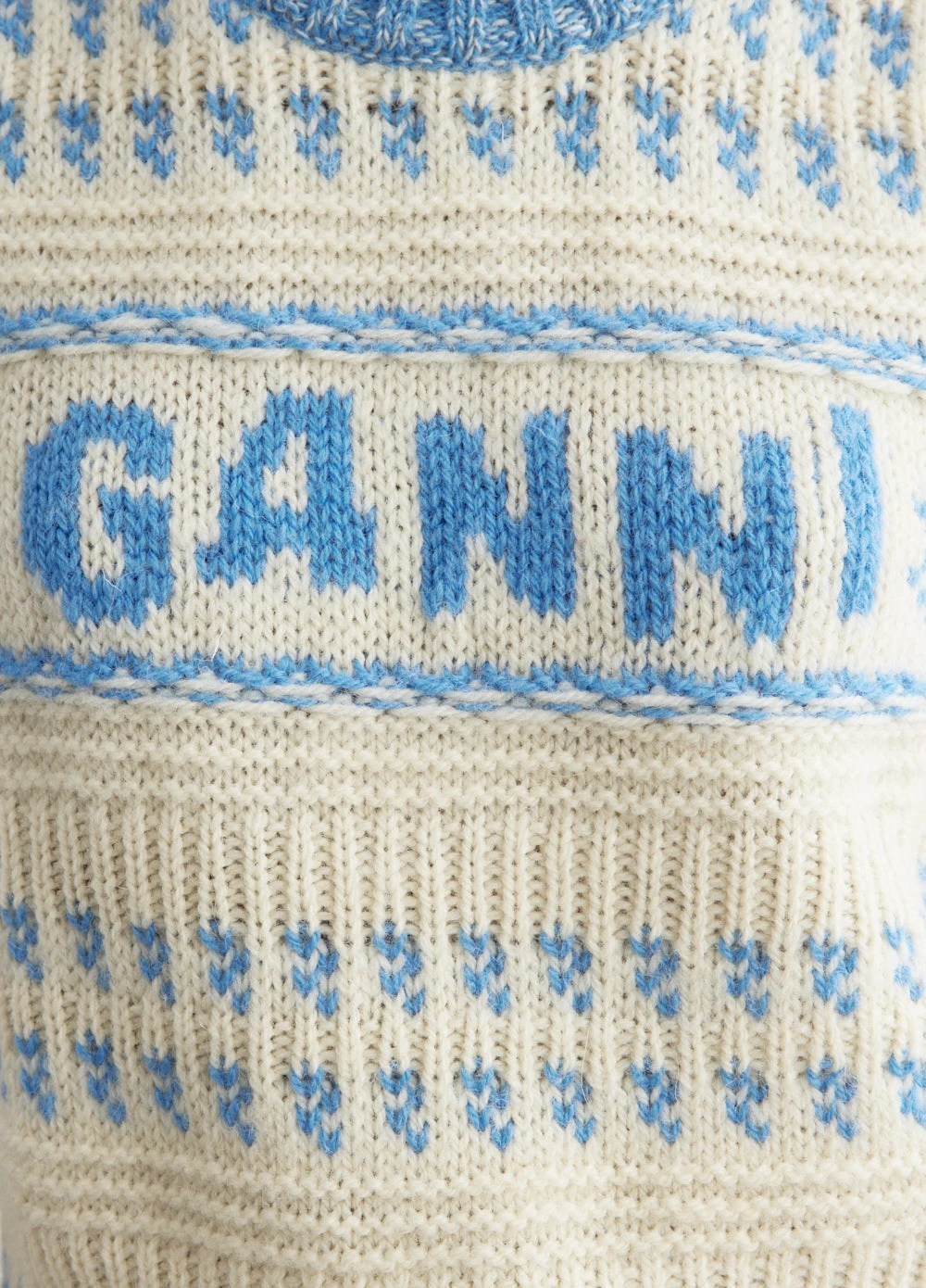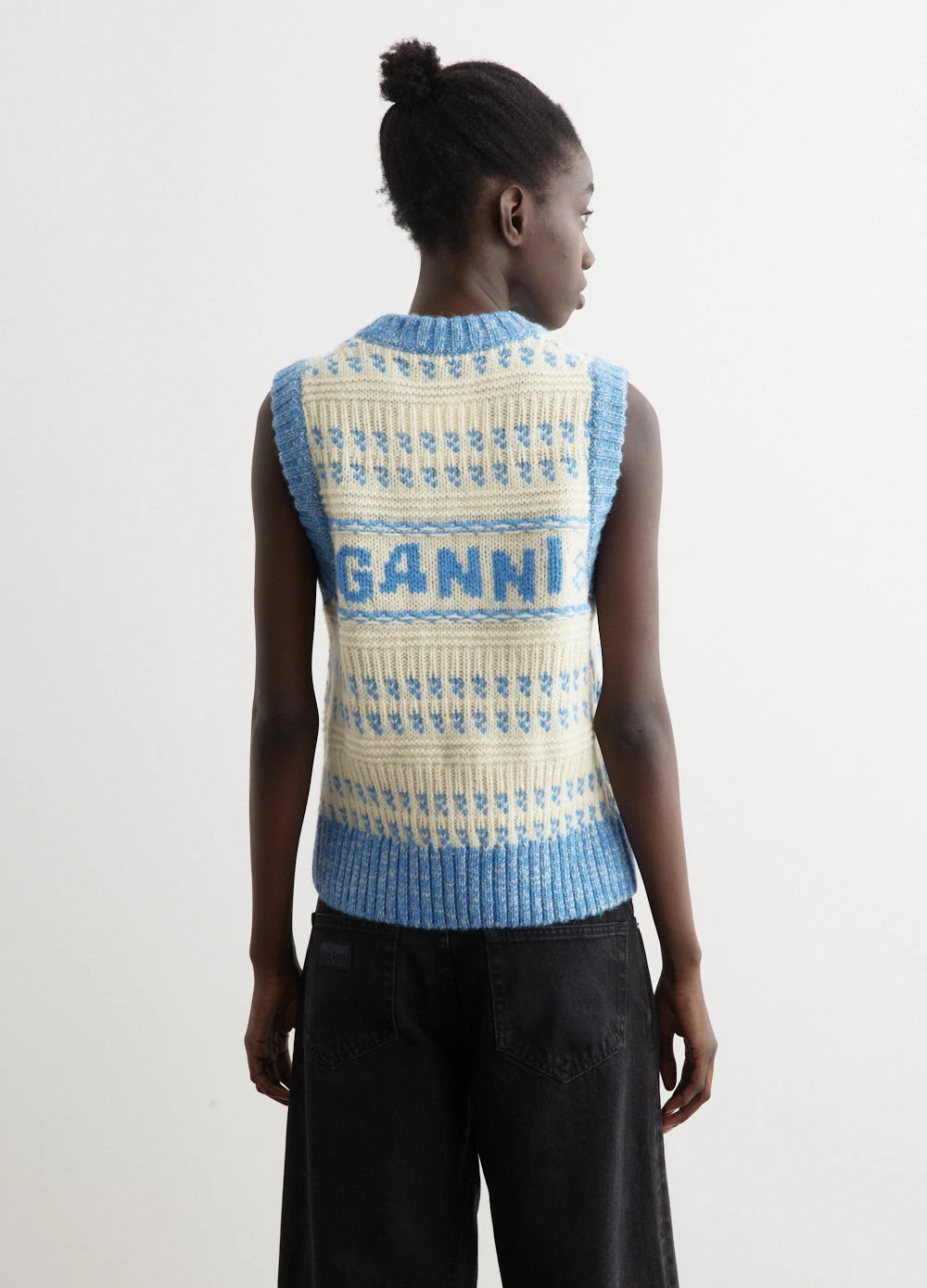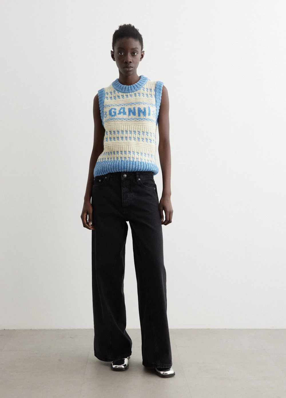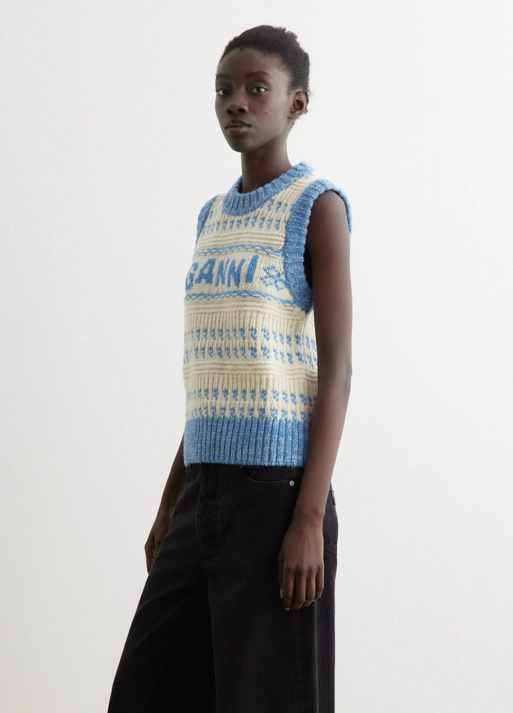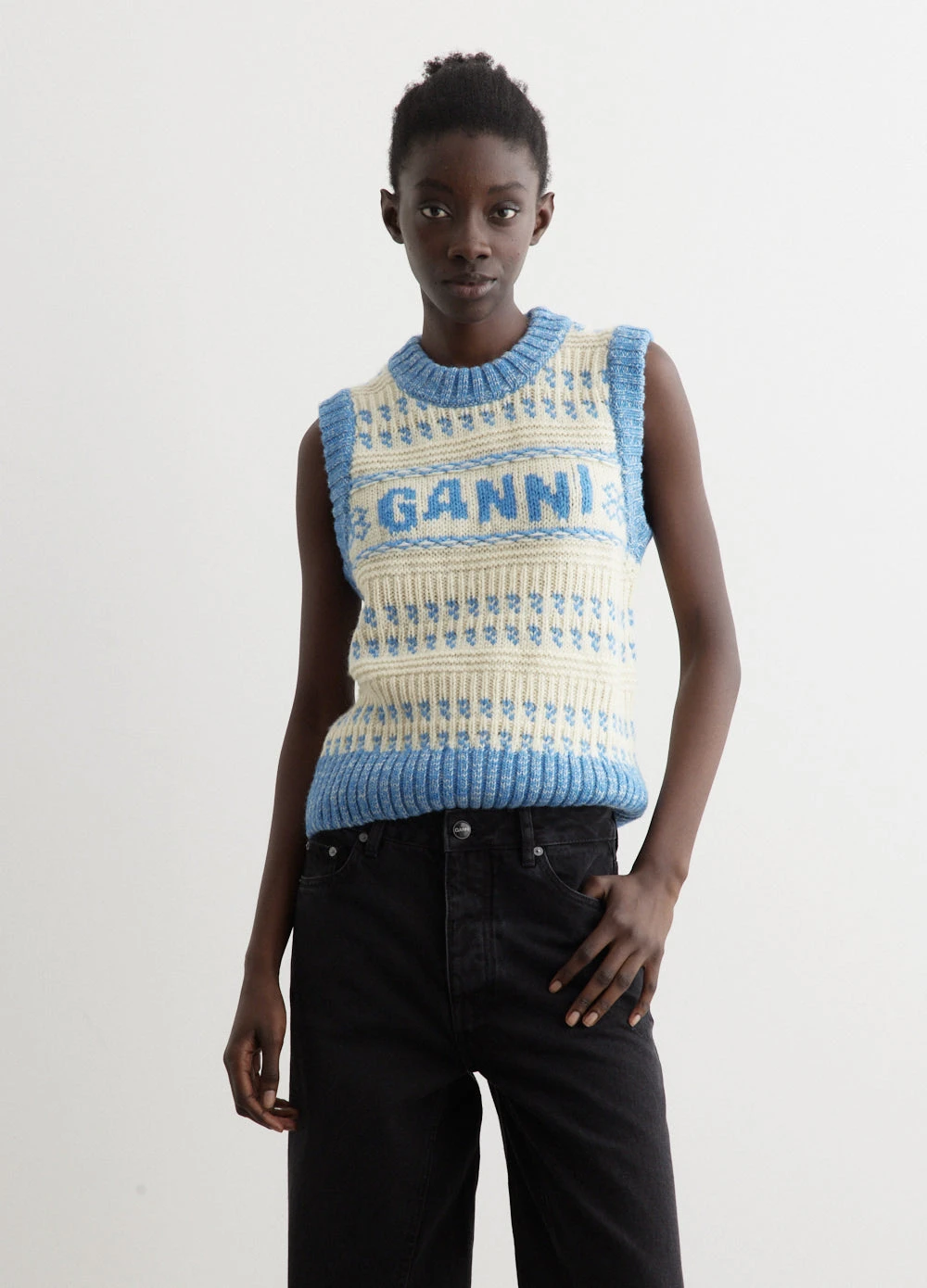 Danish label Ganni blends streetwear trends with a playful touch of humour through bold prints and colour palettes, voluminous silhouettes and easy-to-wear fabrics. Knitted from an organic wool blend, the Graphic Lambswool Cropped O-Neck Vest is designed for a relaxed fit. Adorned with a round neckline, rib edges and a graphic GANNI pattern.