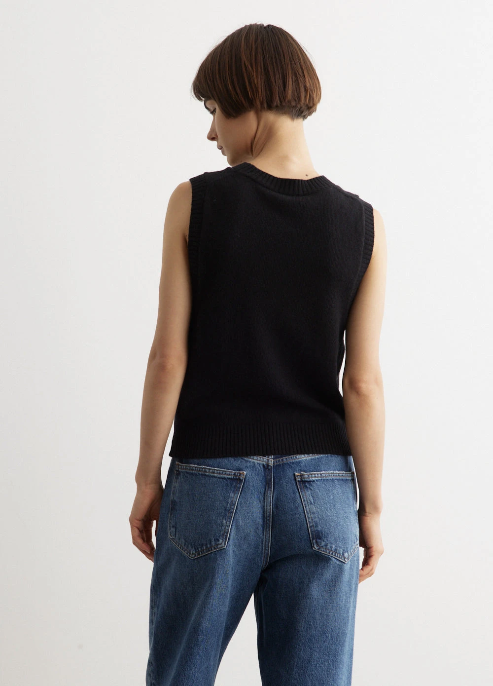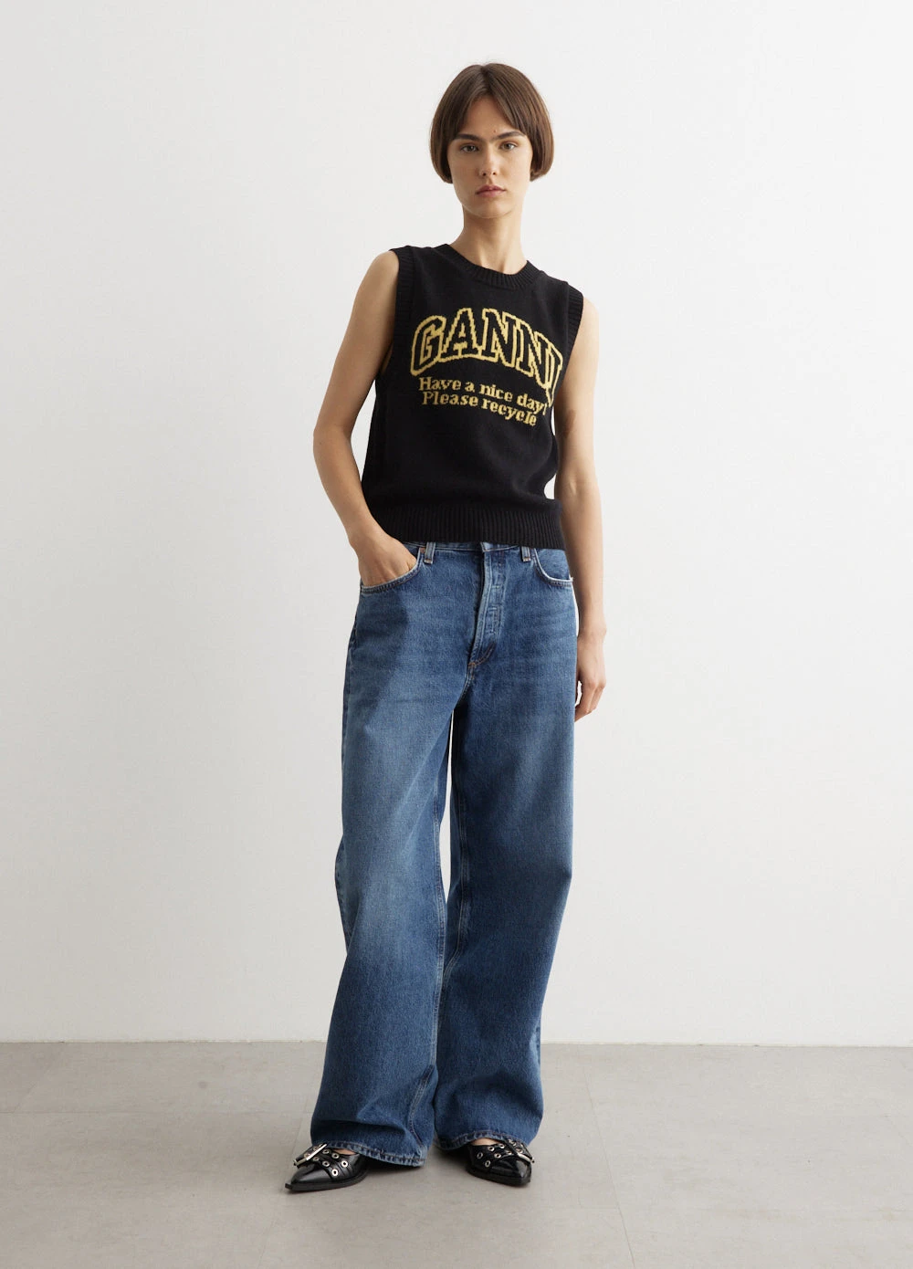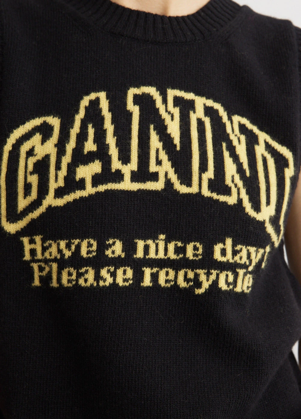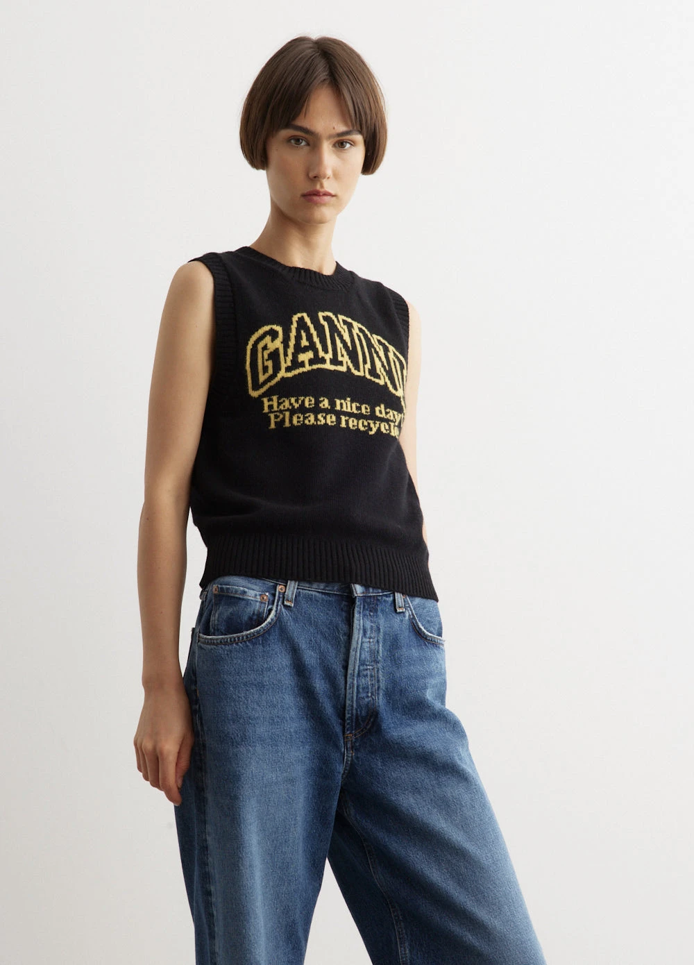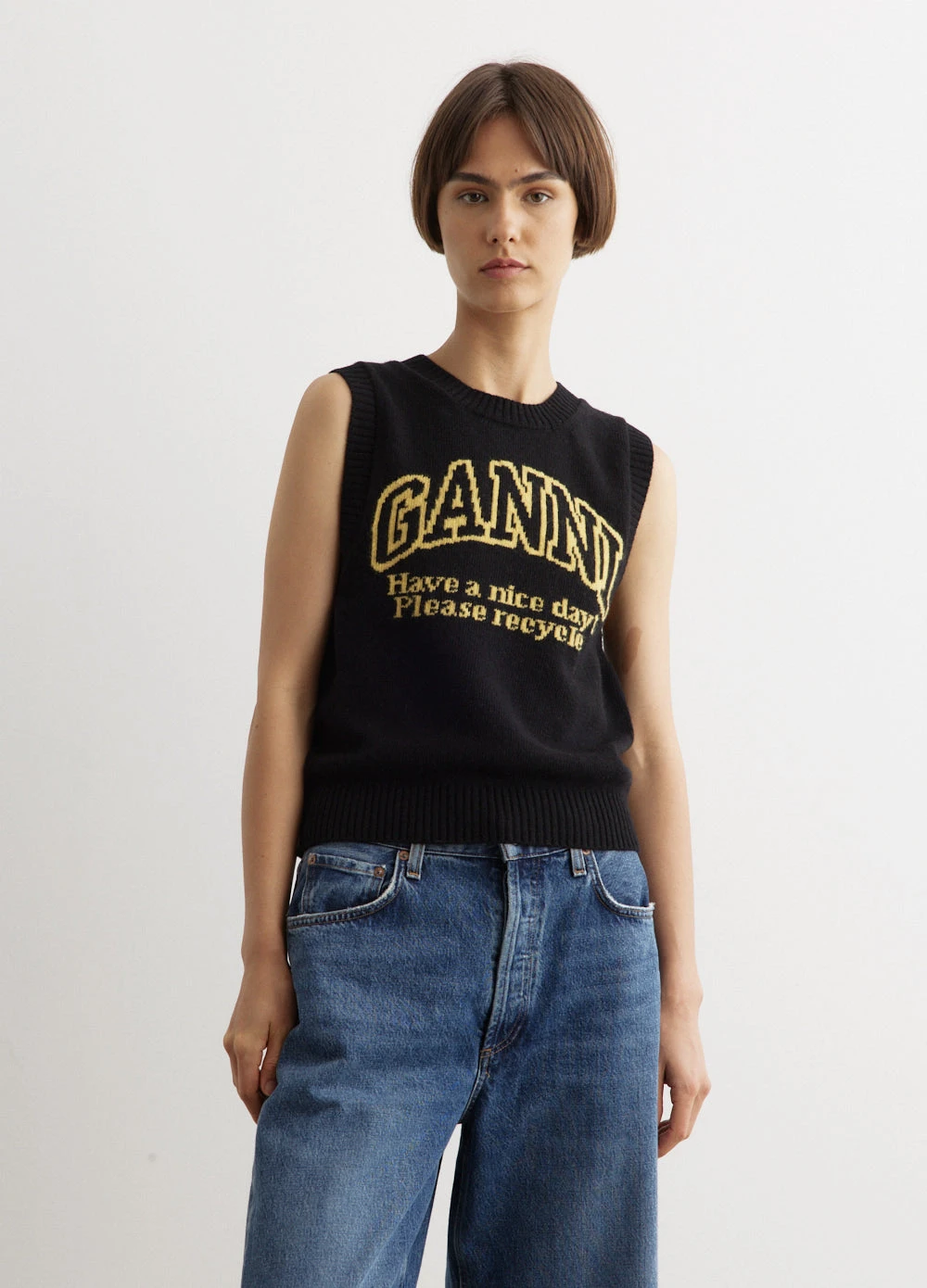 Danish label Ganni blends streetwear trends with a playful touch of humour through bold prints and colour palettes, voluminous silhouettes and easy-to-wear fabrics. Knitted from a soft wool blend, the Graphic O-Neck Vest boasts a contrasting woven logo on the front.Â