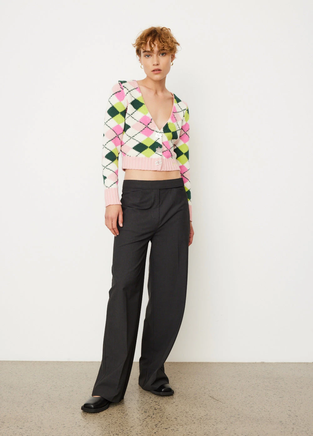 Danish label Ganni blends streetwear trends with a playful touch of humour through bold prints and colour palettes, voluminous silhouettes and easy-to-wear fabrics. Knitted from organic cotton, the Graphic V-Neck Cardigan is patterned with vibrant diamonds and embellished with the label’s ‘Butterfly’ logo buttons. The embroidered GANNI logo on the hem finishes the silhouette.