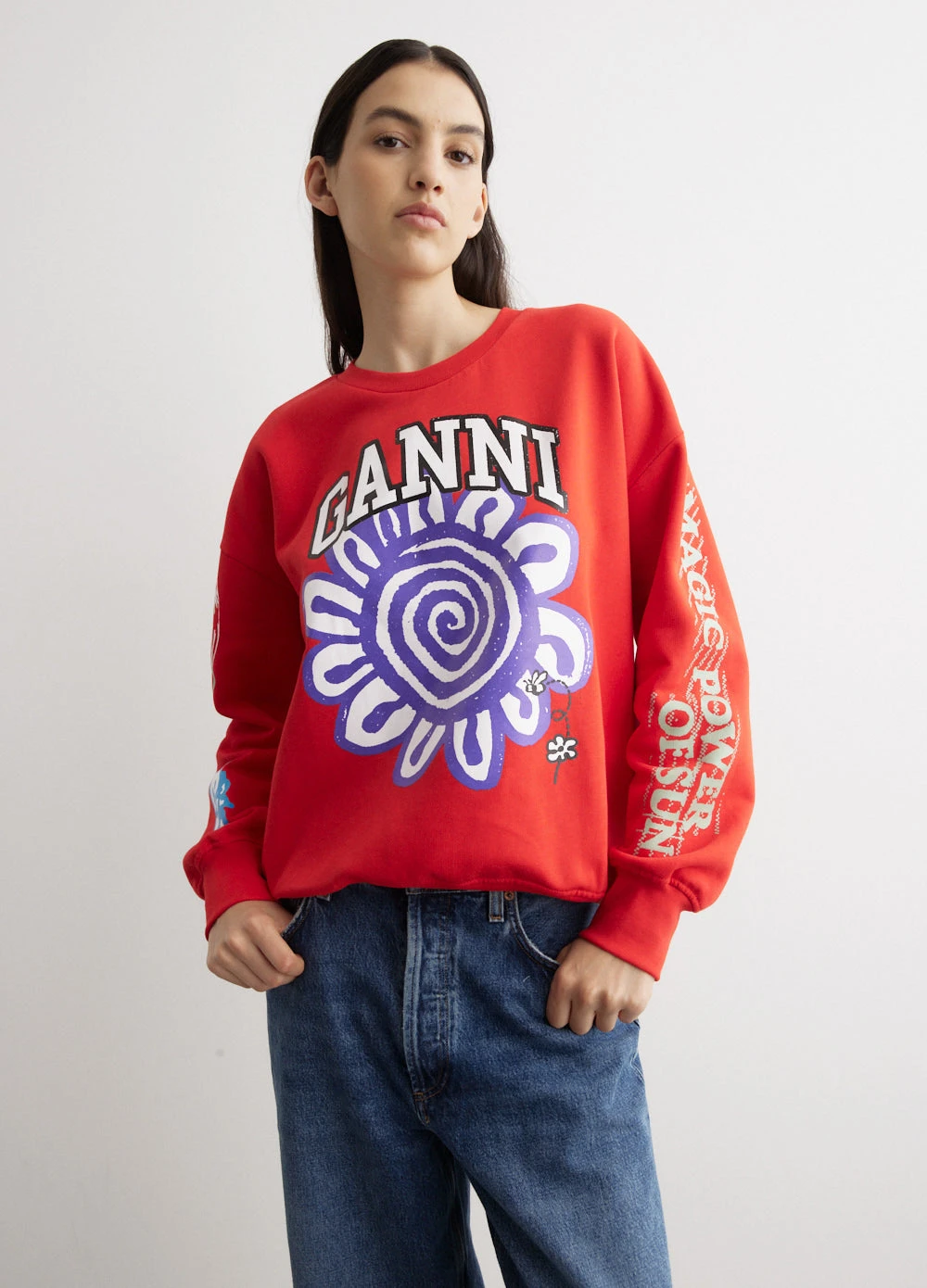 Danish label Ganni blends streetwear trends with a playful touch of humour through bold prints and colour palettes, voluminous silhouettes and easy-to-wear fabrics. Crafted from organic cotton, the Isoli Mega Flower Oversized Sweatshirt is adorned with the brands signature flower print across the front and logo graphics on both sleeves.