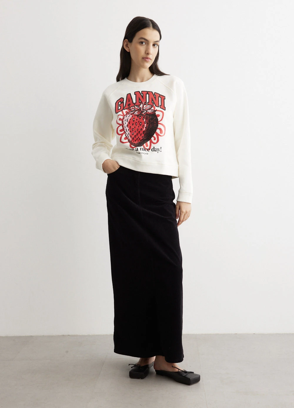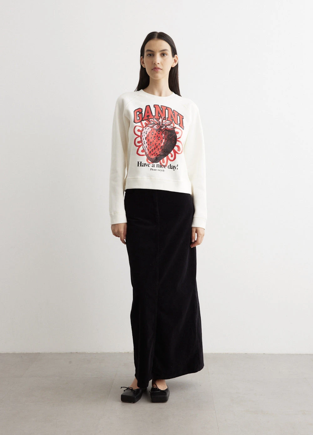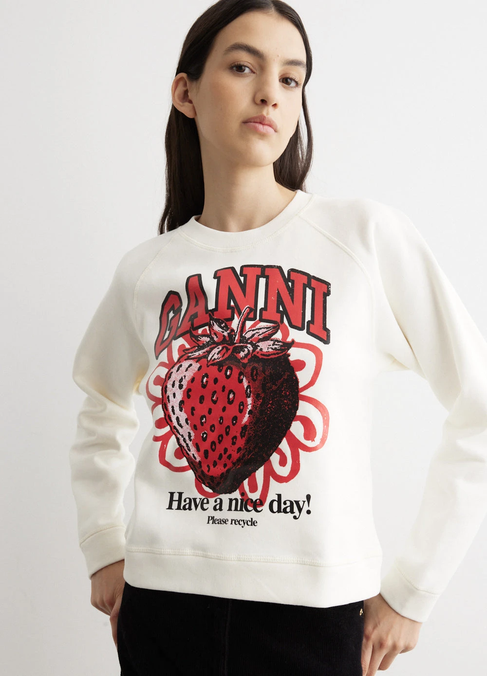 Danish label Ganni blends streetwear trends with a playful touch of humour through bold prints and colour palettes, voluminous silhouettes and easy-to-wear fabrics. Constructed of organic cotton, the Isoli Raglan Strawberry Sweatshirt features a classic fit, a round neckline, and long raglan sleeves. Eye-catching logo graphics decorate the design.