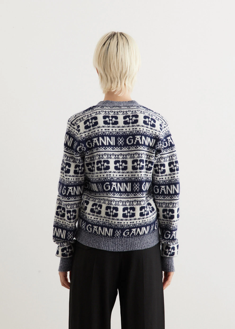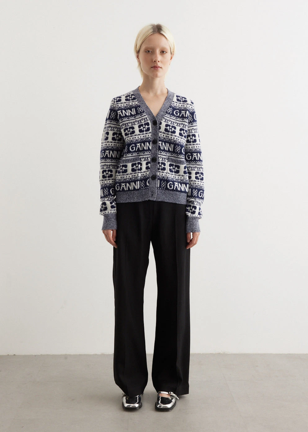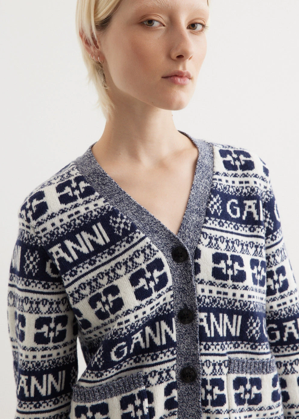 Danish label Ganni blends streetwear trends with a playful touch of humour through bold prints and colour palettes, voluminous silhouettes and easy-to-wear fabrics. Knitted from a wool blend fabric, the Logo Wool Mix Cardigan flaunts an intricate intarsia logo pattern, finished with GANNI logos throughout.