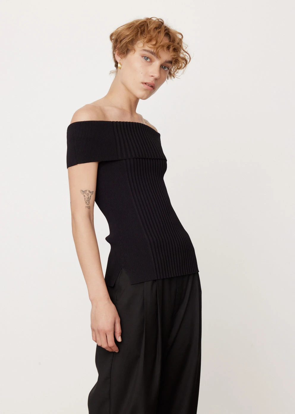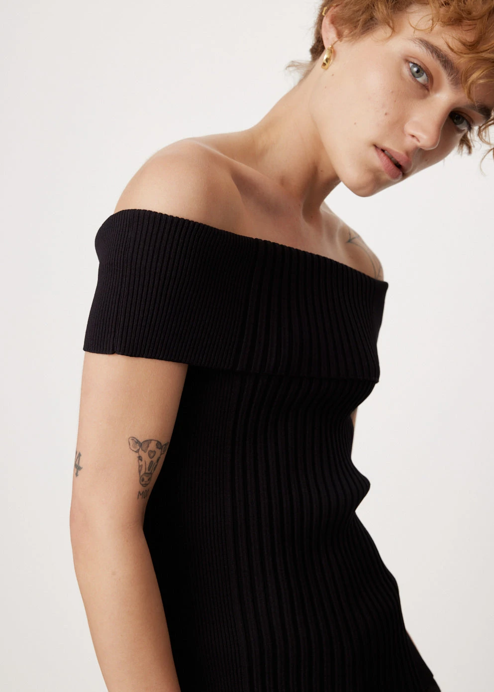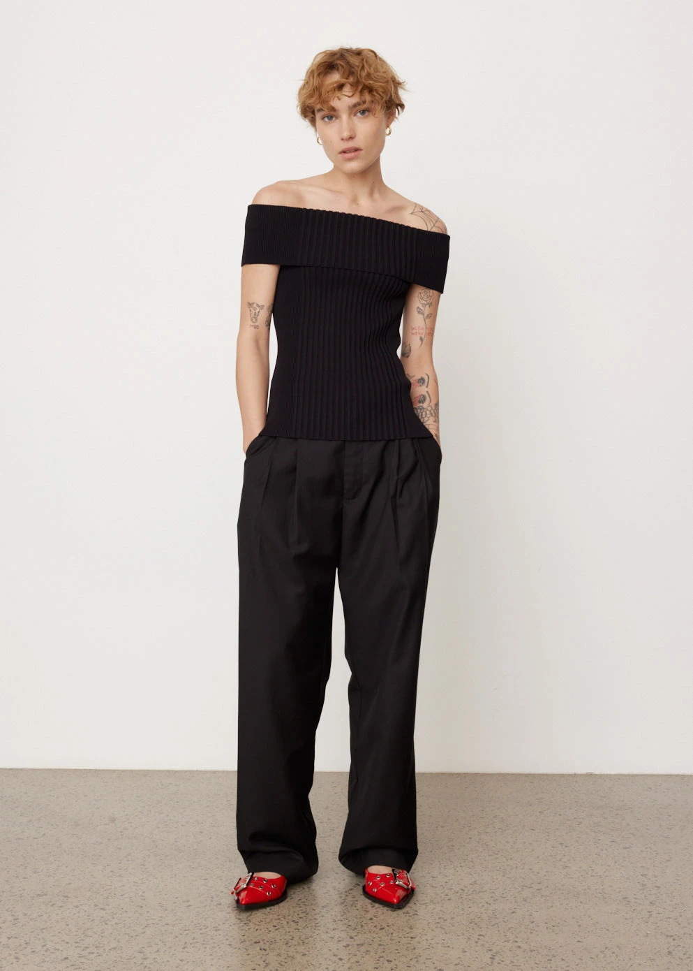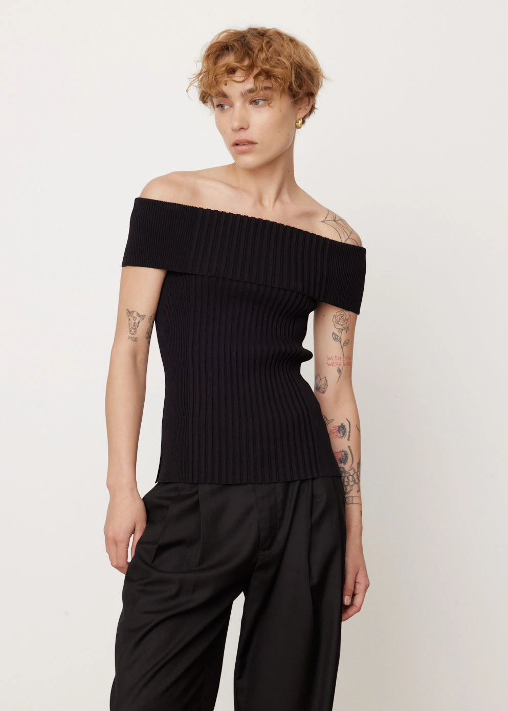 Danish label Ganni blends streetwear trends with a playful touch of humour through bold prints and colour palettes, voluminous silhouettes and easy-to-wear fabrics. Crafted from a stretchy rayon blend fabric with a ribbed texture, the Melange Knit Off Shoulder Top is framed by its off-shoulder neckline and fitting design.Â