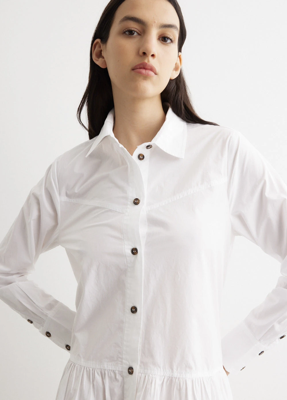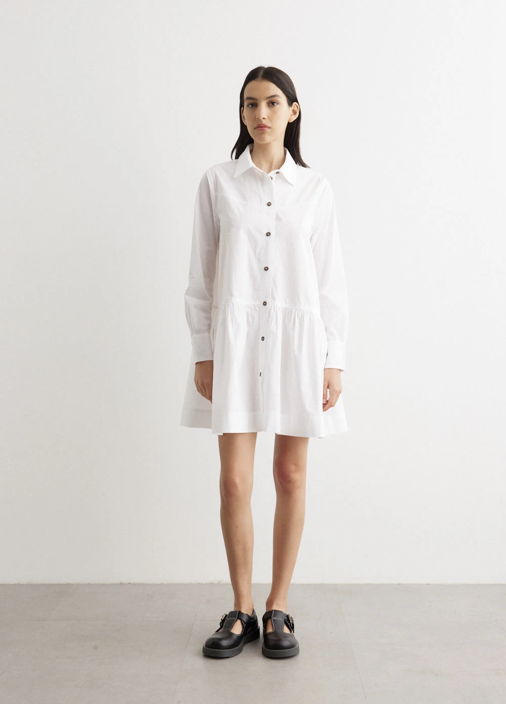 Danish label Ganni blends streetwear trends with a playful touch of humour through bold prints and colour palettes, voluminous silhouettes and easy-to-wear fabrics. Made from cotton poplin with a slightly sheer finish, the Mini Shirt Dress is a timeless silhouette that’s cut to a relaxed fit. It features classic shirting features with its button down closure and long sleeves.Â