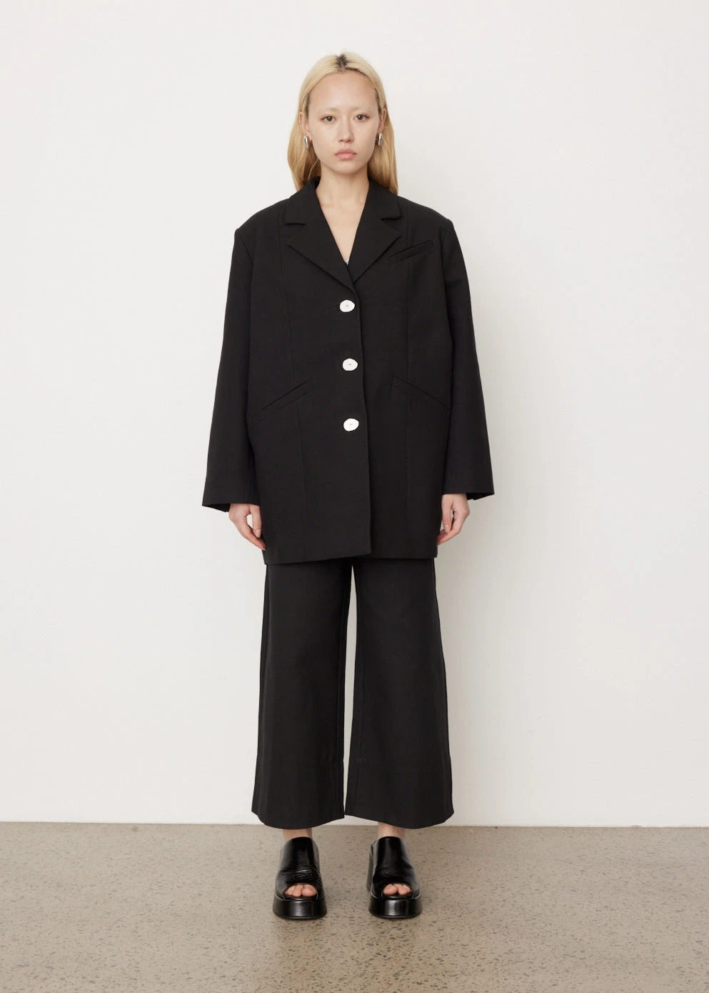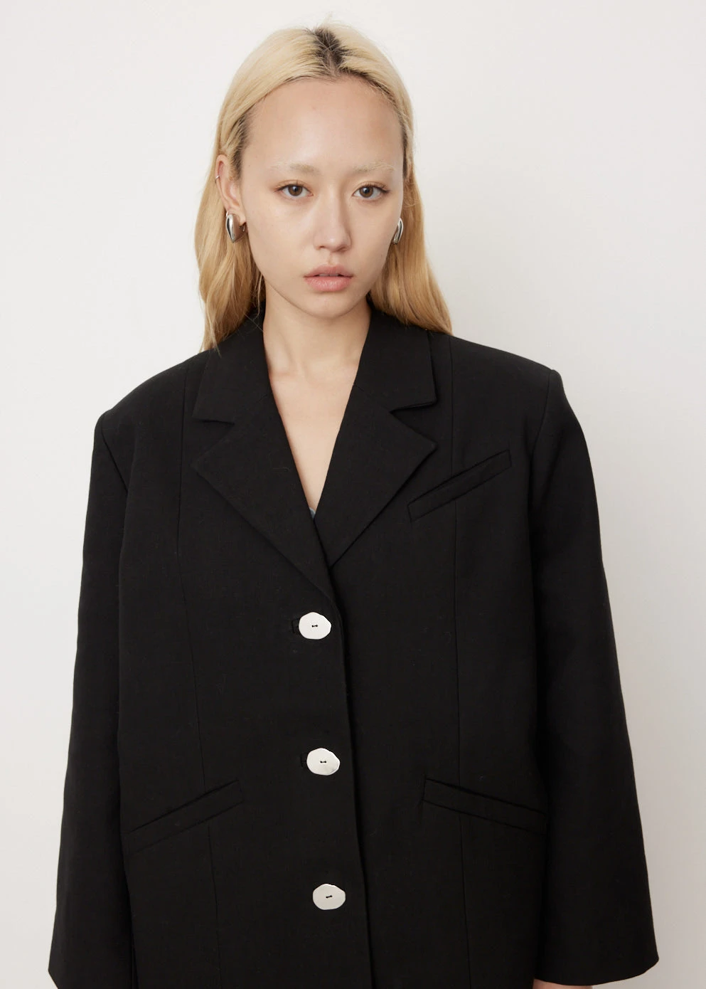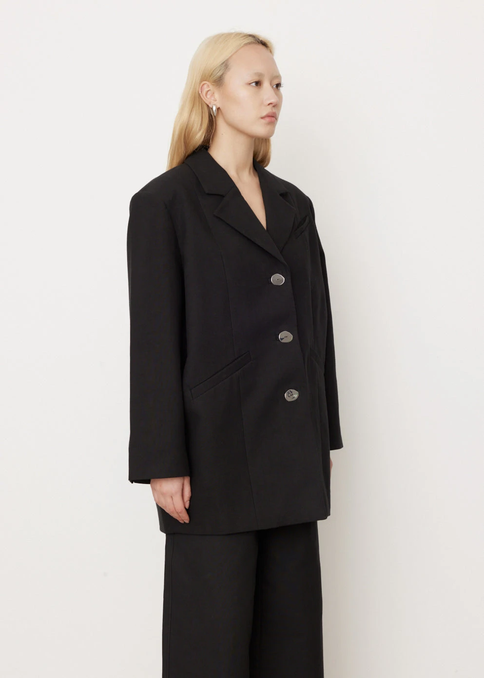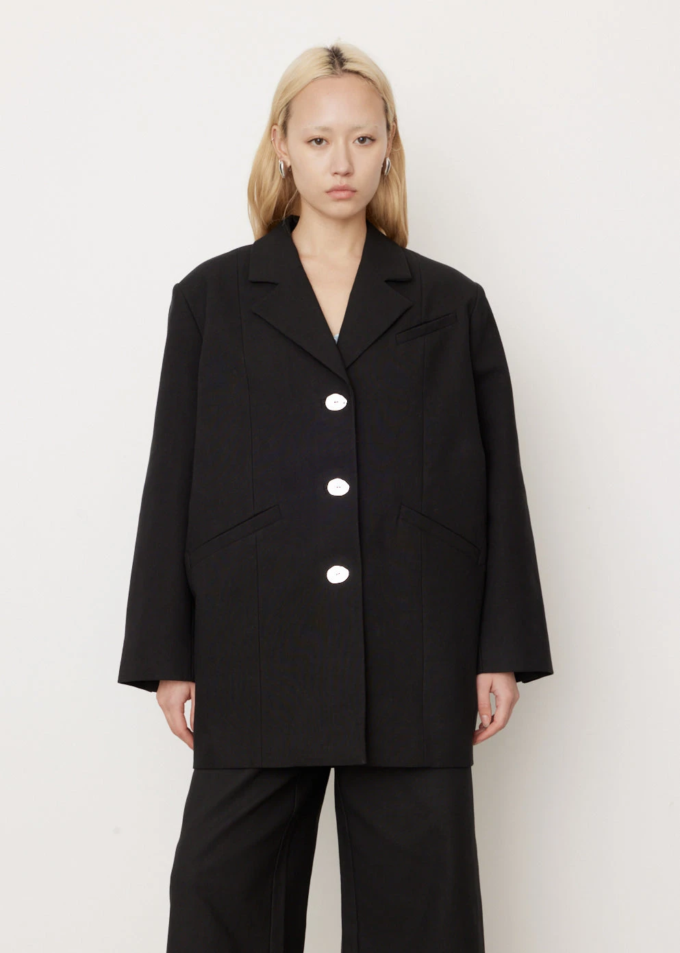 Danish label Ganni blends streetwear trends with a playful touch of humour through bold prints and colour palettes, voluminous silhouettes and easy-to-wear fabrics. Crafted from cotton suiting,Β the Oversized Blazer is a timeless silhouette with a contemporary touch, featuring contrasting buttons andΒ wide long sleeves.
