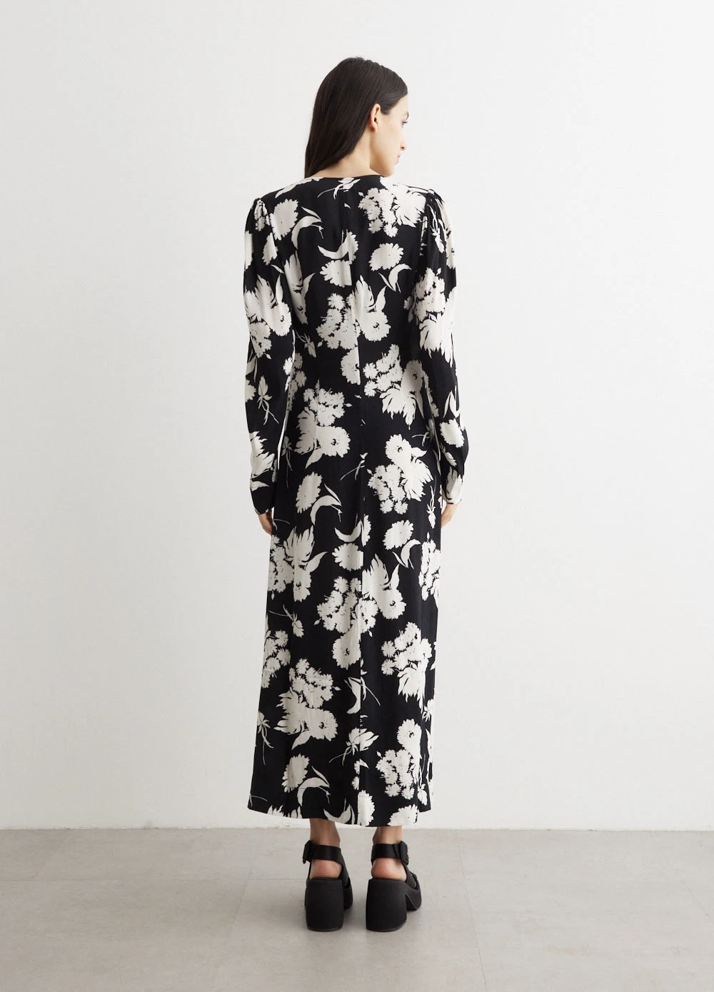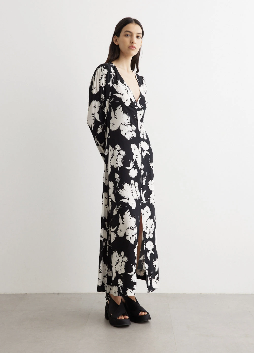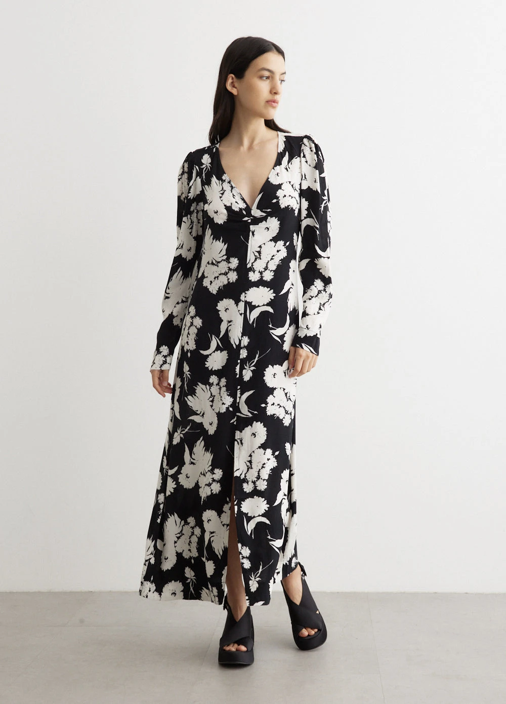 Danish label Ganni blends streetwear trends with a playful touch of humour through bold prints and colour palettes, voluminous silhouettes and easy-to-wear fabrics. The Printed Crepe V-Neck Dress is tailored down to an ankle-length, with a regular fit. It’s decorated with an all-over floral print, along with a high slit at the front for a charming touch.