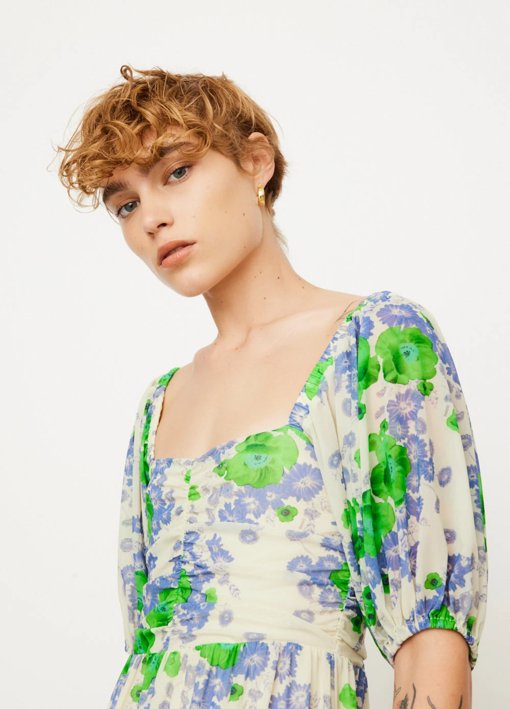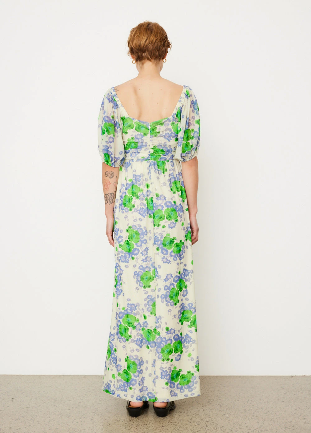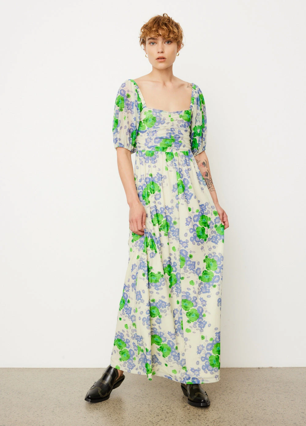 Danish label Ganni blends streetwear trends with a playful touch of humour through bold prints and colour palettes, voluminous silhouettes and easy-to-wear fabrics. Made from a recycled nylon blend fabric, the Printed Mesh Puff Sleeves Long Dress is adorned with a floral print. It effortlessly drapes over the body and features a sweetheart-neckline for an elegant finish.