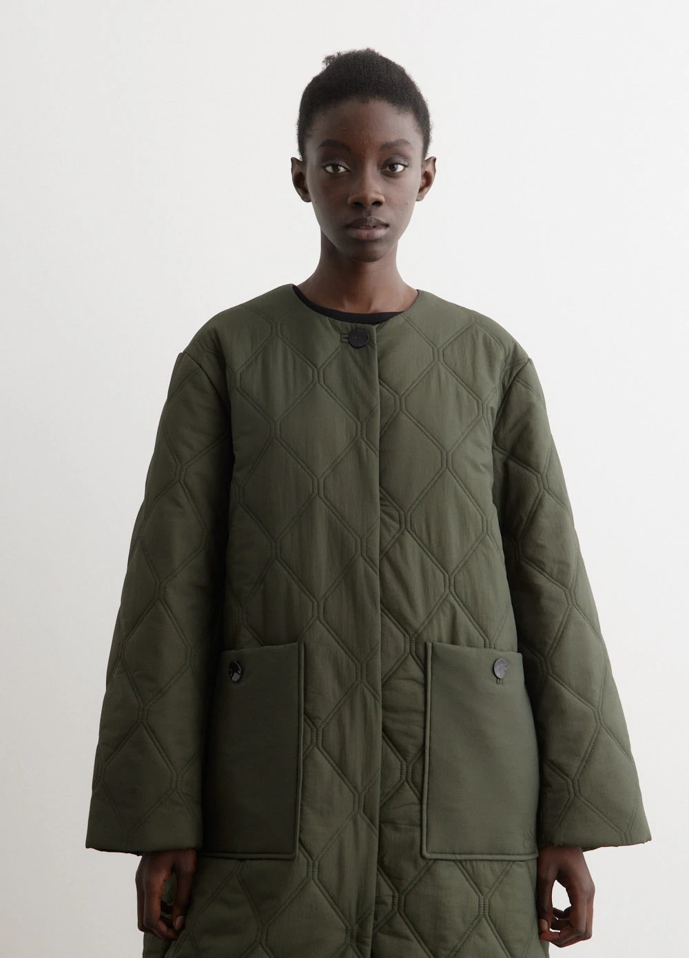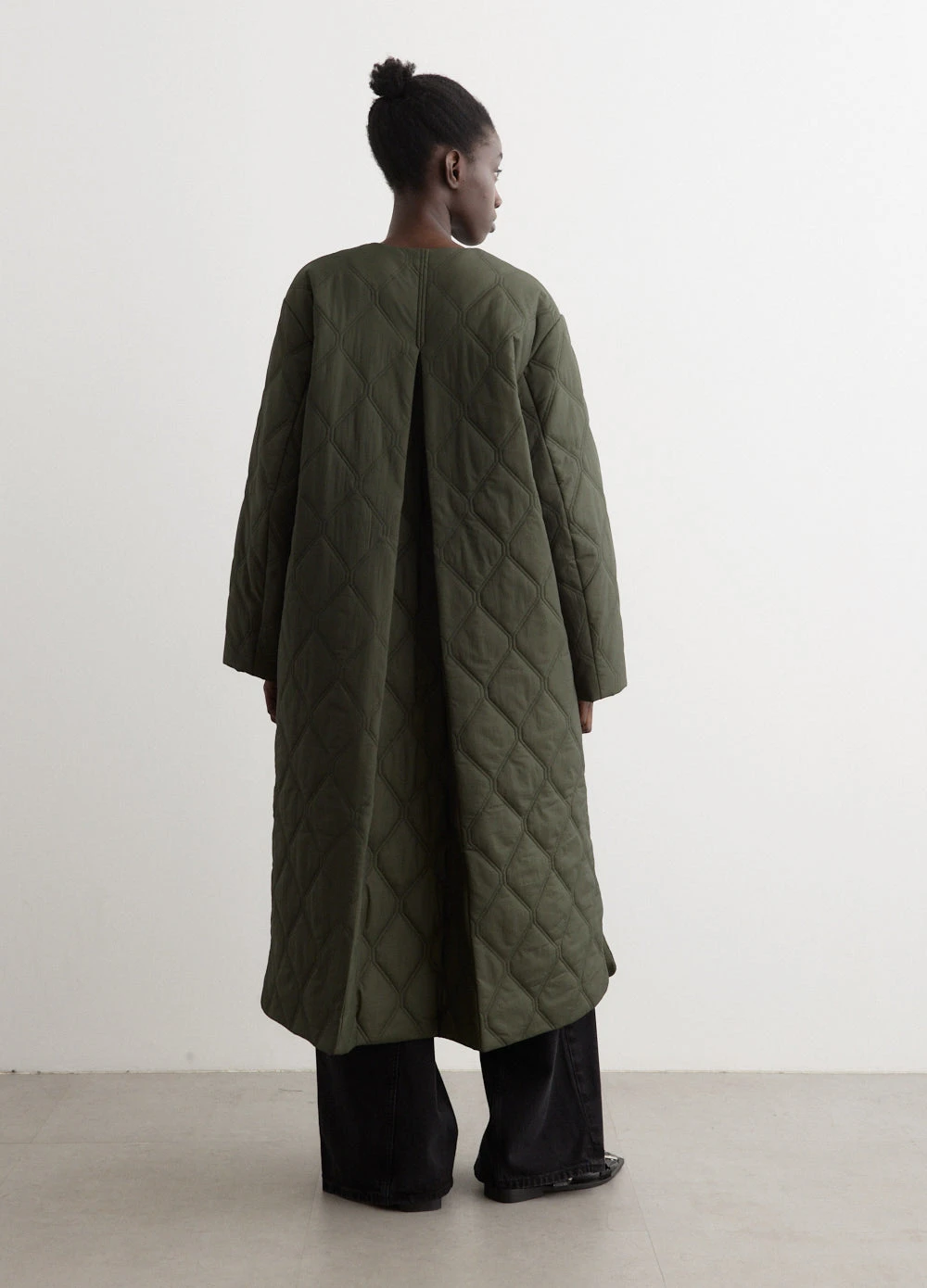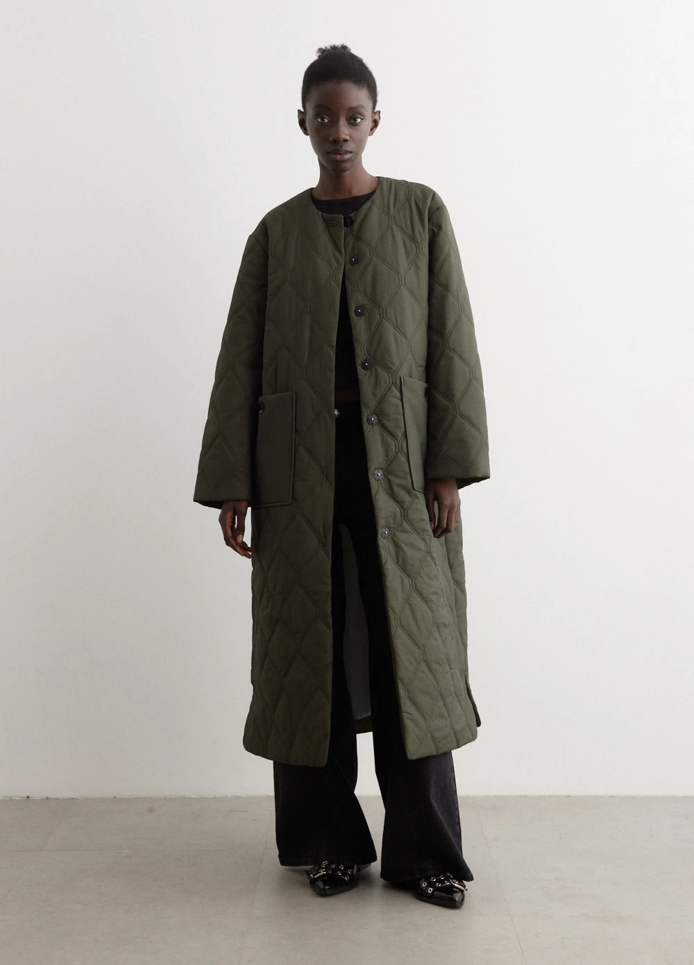 Danish label Ganni blends streetwear trends with a playful touch of humour through bold prints and colour palettes, voluminous silhouettes and easy-to-wear fabrics. Made from quilted recycled polyamide fabric, the Quilt Long Coat boasts a longline silhouette and features front patch pockets.