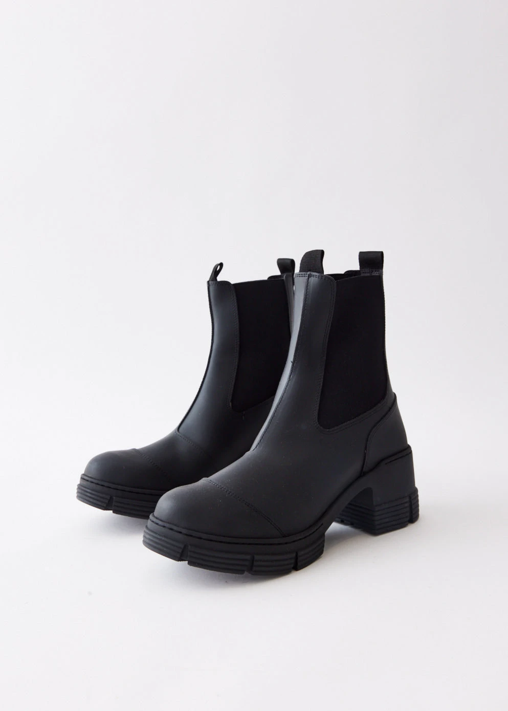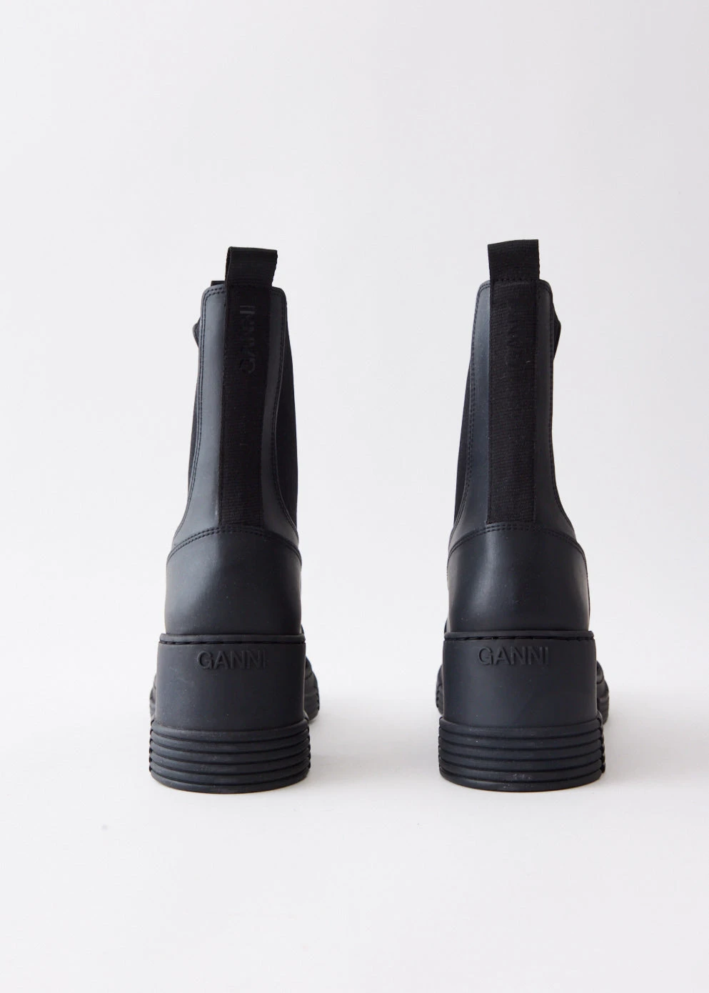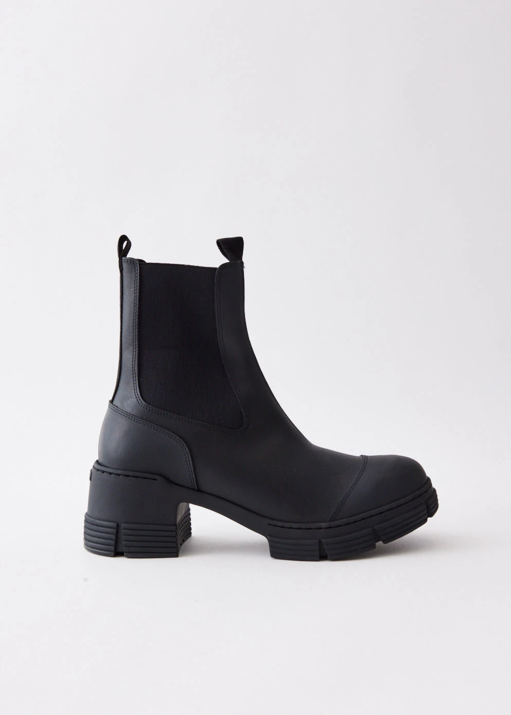 Danish label Ganni blends streetwear trends with a playful touch of humour through bold prints and colour palettes, voluminous silhouettes and easy-to-wear fabrics. Constructed from a recycled rubber blend fabric, the Recycled Rubber Heeled City Boot is a minimal design that’s distinct with its high-heeled sole.