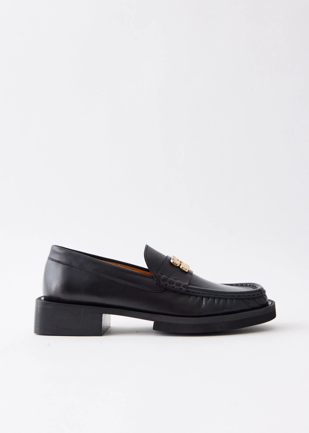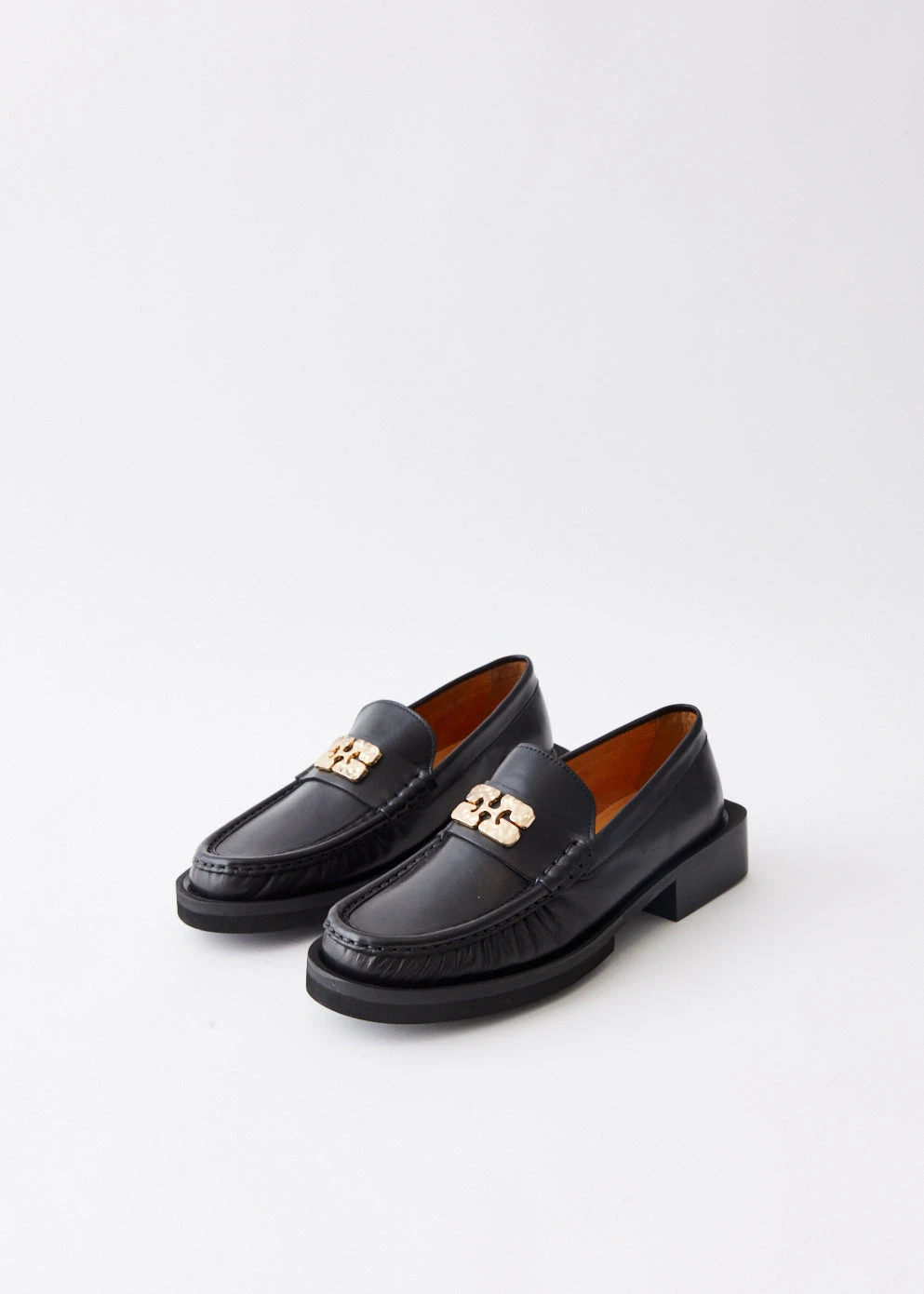 Danish label Ganni blends streetwear trends with a playful touch of humour through bold prints and colour palettes, voluminous silhouettes and easy-to-wear fabrics. Crafted from smooth leather, the Rhinestone Logo Loafers are a classic silhouette that offers a chic aesthetic with a GANNI Butterfly motif with rhinestones.