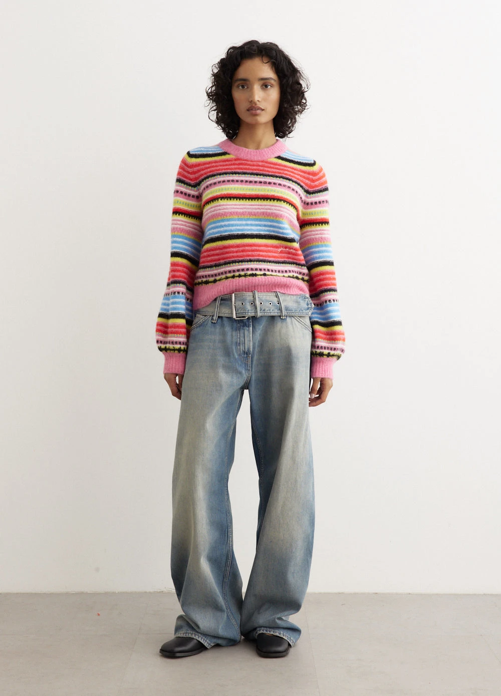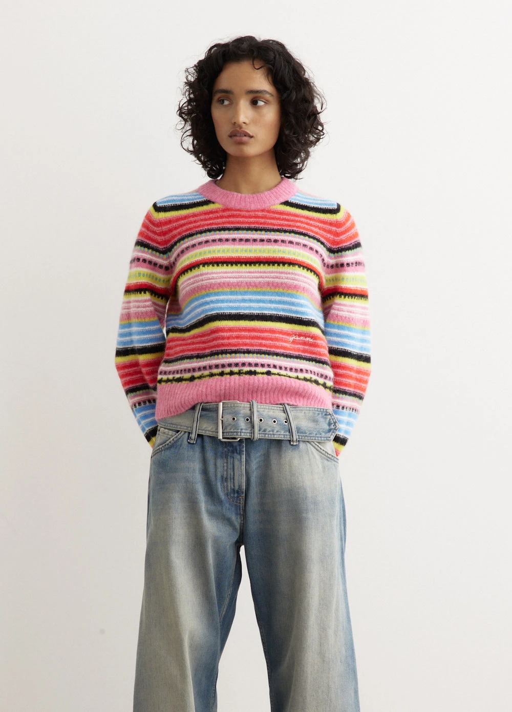 Danish label Ganni blends streetwear trends with a playful touch of humour through bold prints and colour palettes, voluminous silhouettes and easy-to-wear fabrics. Knitted from an organic wool blend, the Soft Wool Stripe O-Neck Sweater is designed for a regular fit. Adorned with a round neckline, rib edges and balloon sleeves.