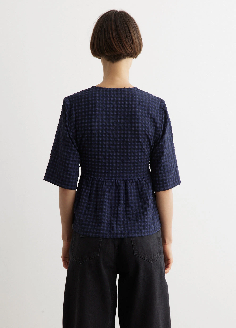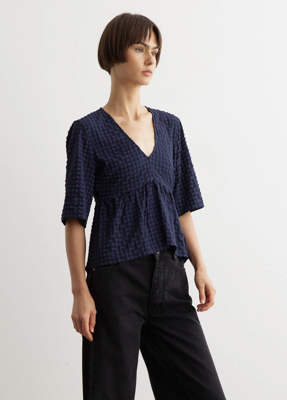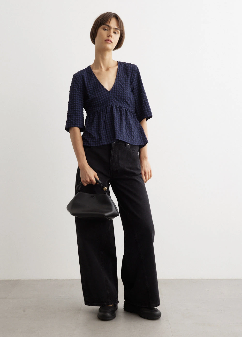 Danish label Ganni blends streetwear trends with a playful touch of humour through bold prints and colour palettes, voluminous silhouettes and easy-to-wear fabrics. The Stretch Seersucker V-Neck Peplum Blouse is crafted from a recycled polyester blend, providing a slim fit with a peplum silhouette. Along with its V-neckline, this model features a zippered closure at the side and elbow-length sleeves.