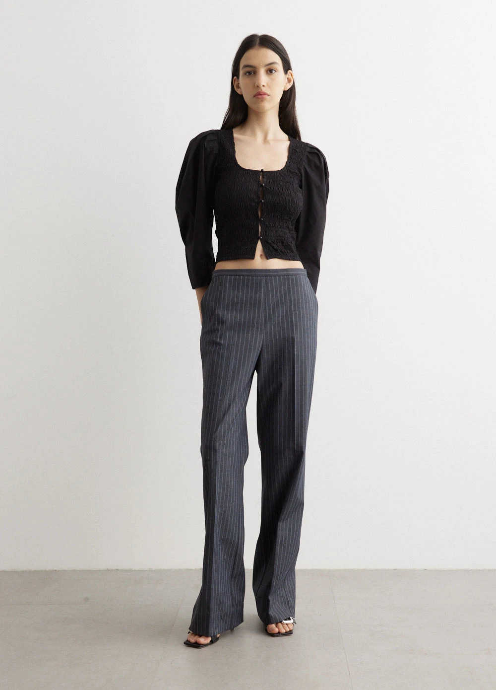 Danish label Ganni blends streetwear trends with a playful touch of humour through bold prints and colour palettes, voluminous silhouettes and easy-to-wear fabrics. Crafted from recycled polyester blend, the Stretch Stripe Mid Waist Pants and tailored to regular fit. Adorned with two side pockets, a decorative back pocket and slits at the back of the legs.
