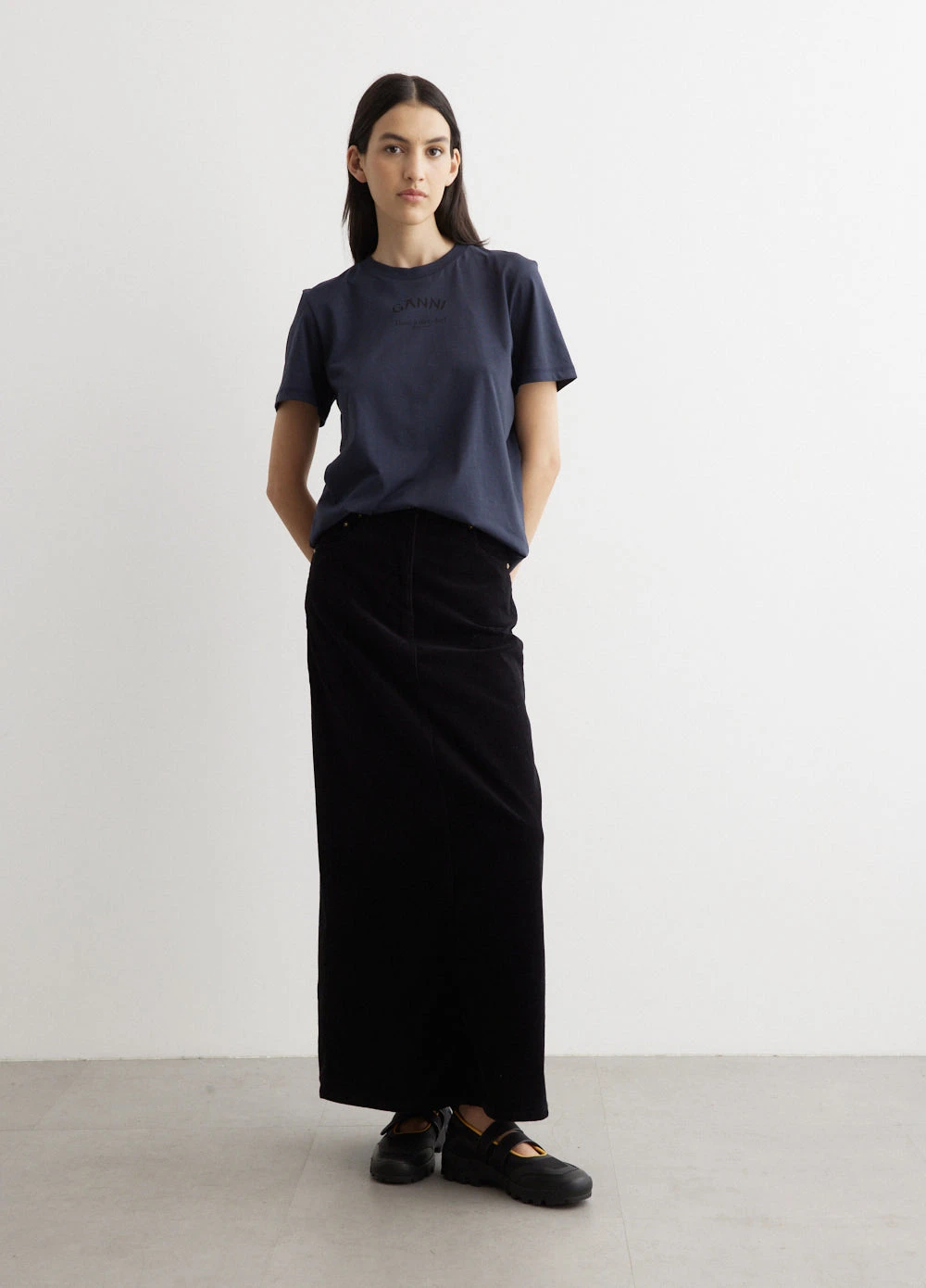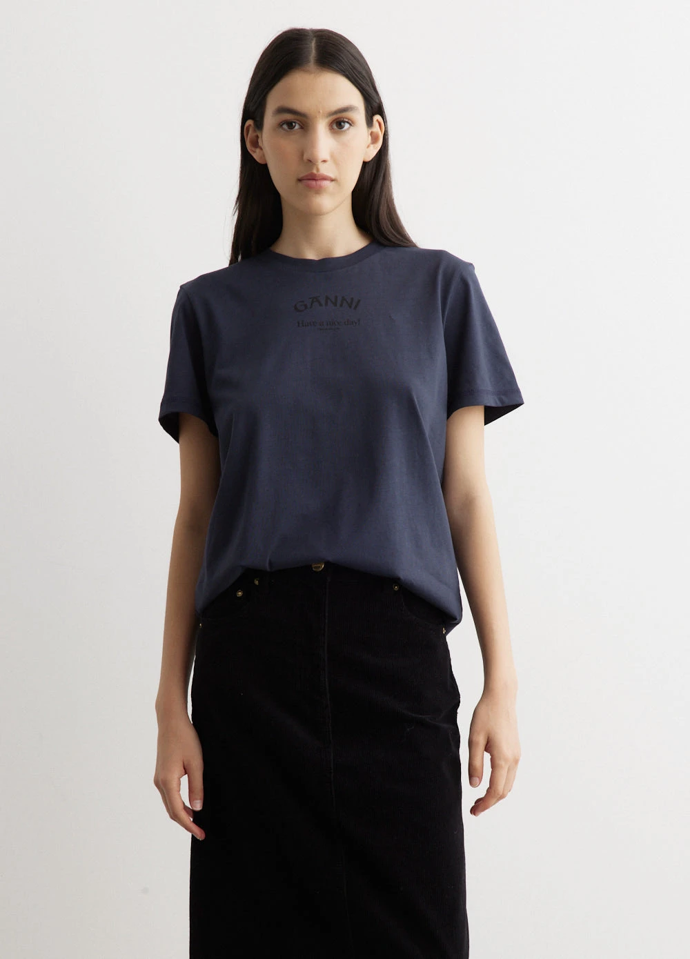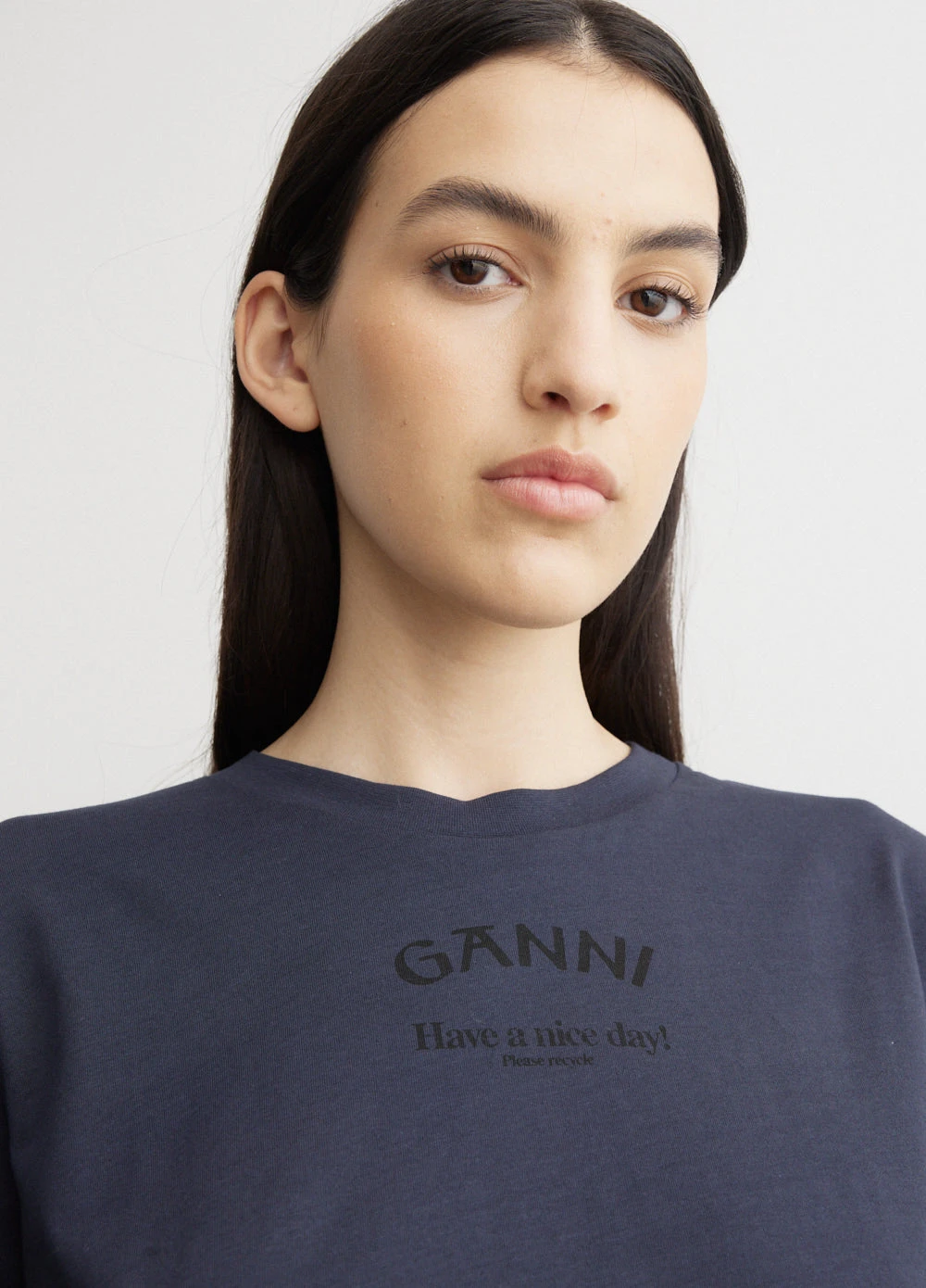 Danish label Ganni blends streetwear trends with a playful touch of humour through bold prints and colour palettes, voluminous silhouettes and easy-to-wear fabrics. Crafted from organic cotton, the Thin Jersey Relaxed O-Neck T-Shirt is adorned with a printed slogan on the front.