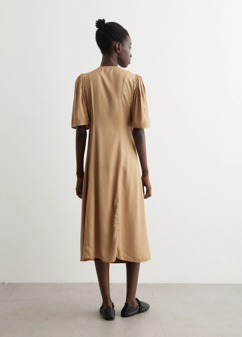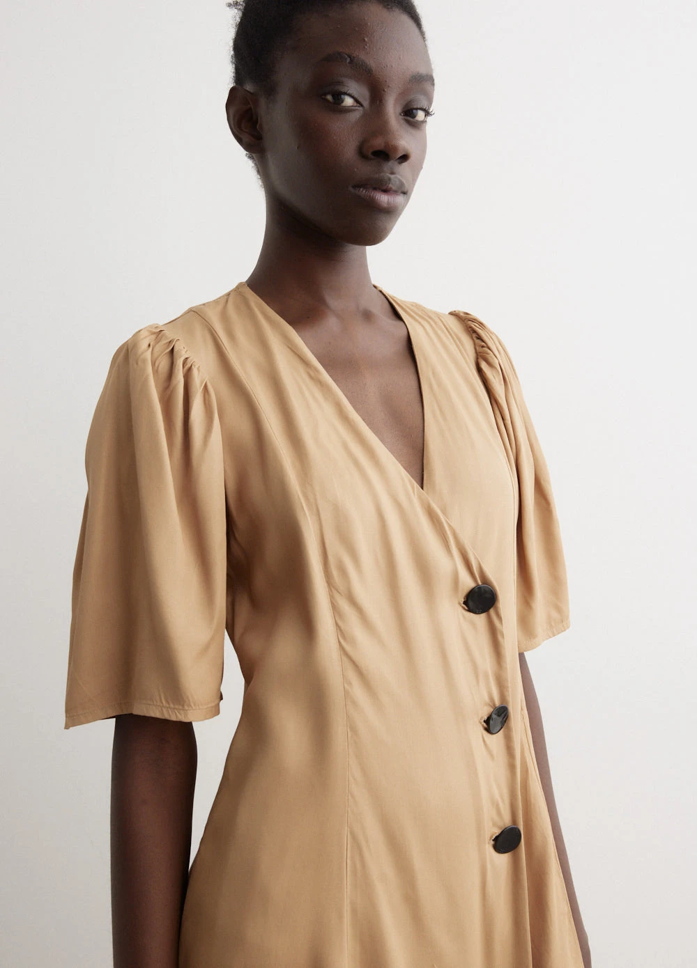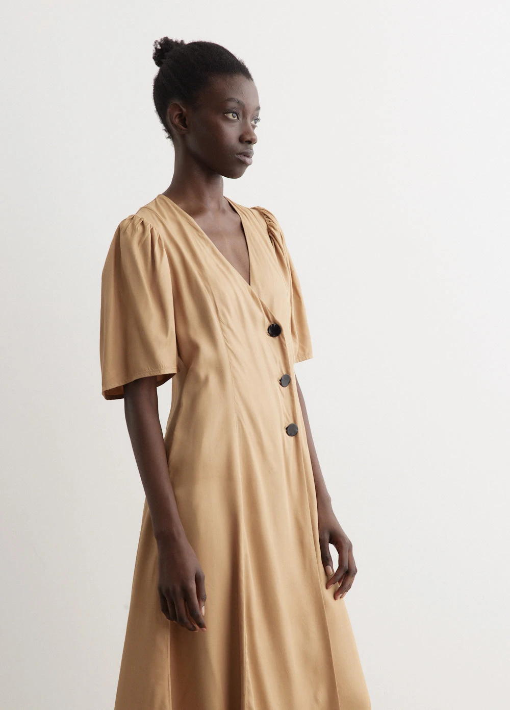 Danish label Ganni blends streetwear trends with a playful touch of humour through bold prints and colour palettes, voluminous silhouettes and easy-to-wear fabrics. Made from fluid viscose, the Wrap Midi Dress boasts a wrap front with an asymmetrical button closure.