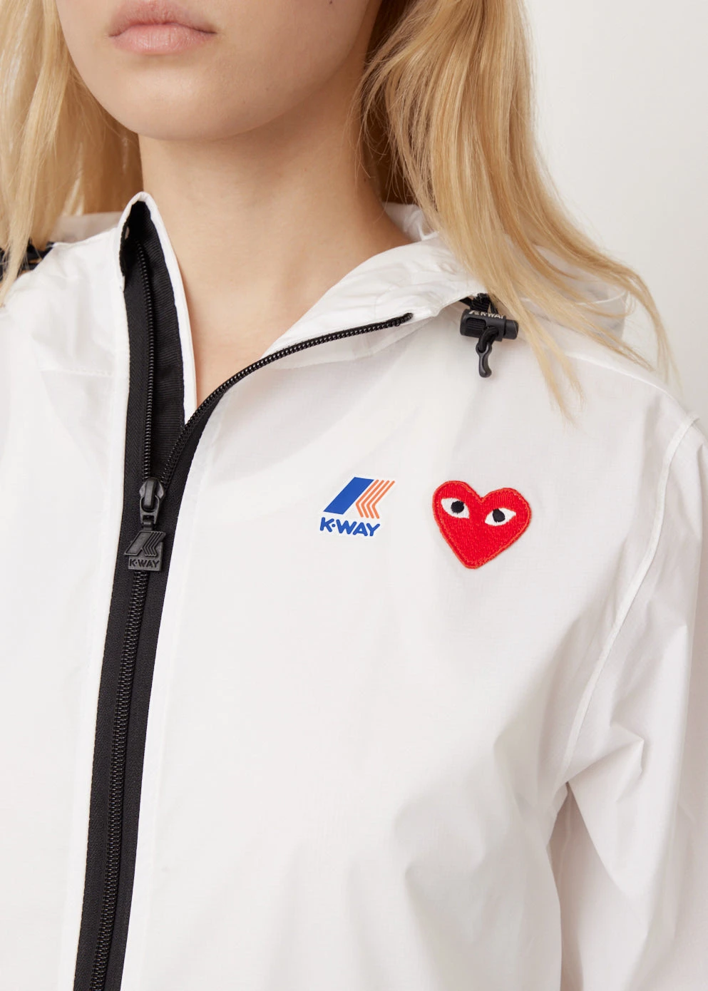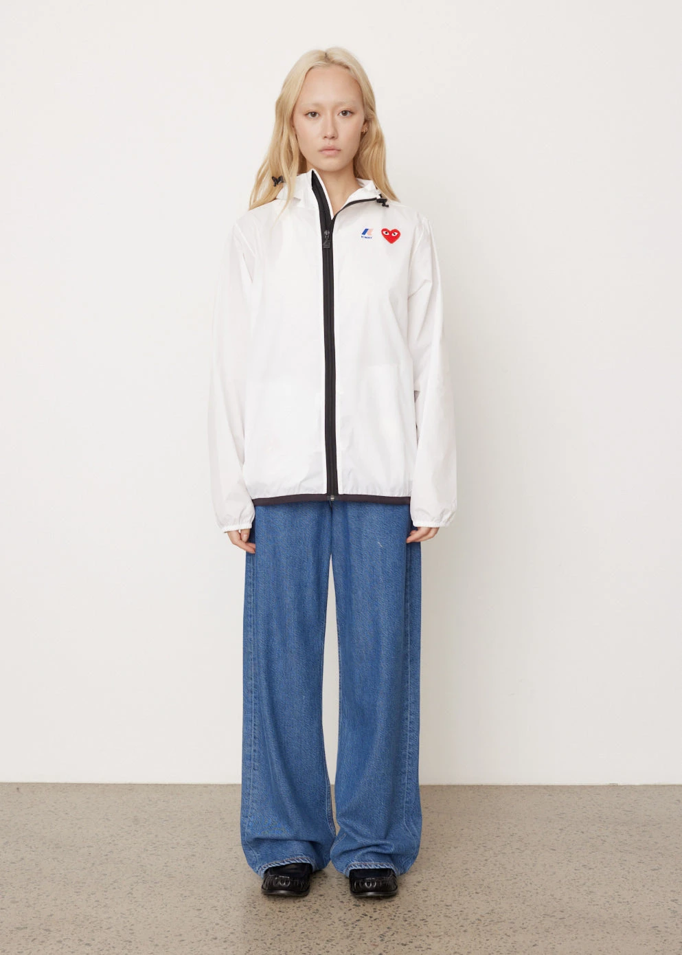 Comme des Garçons Play collaborates with French outerwear brand K-Way on this one-of-a-kind rendition of the brand’s most iconic rain jackets, the Leon Half Zip and Claude Full Zip. The J501 K-Way Hoodie Full Zip Jacket is constructed of lightweight, water-resistant nylon and features the duo’s signature logos on the chest and back. Wear this versatile jacket in the rain, hail or shine.