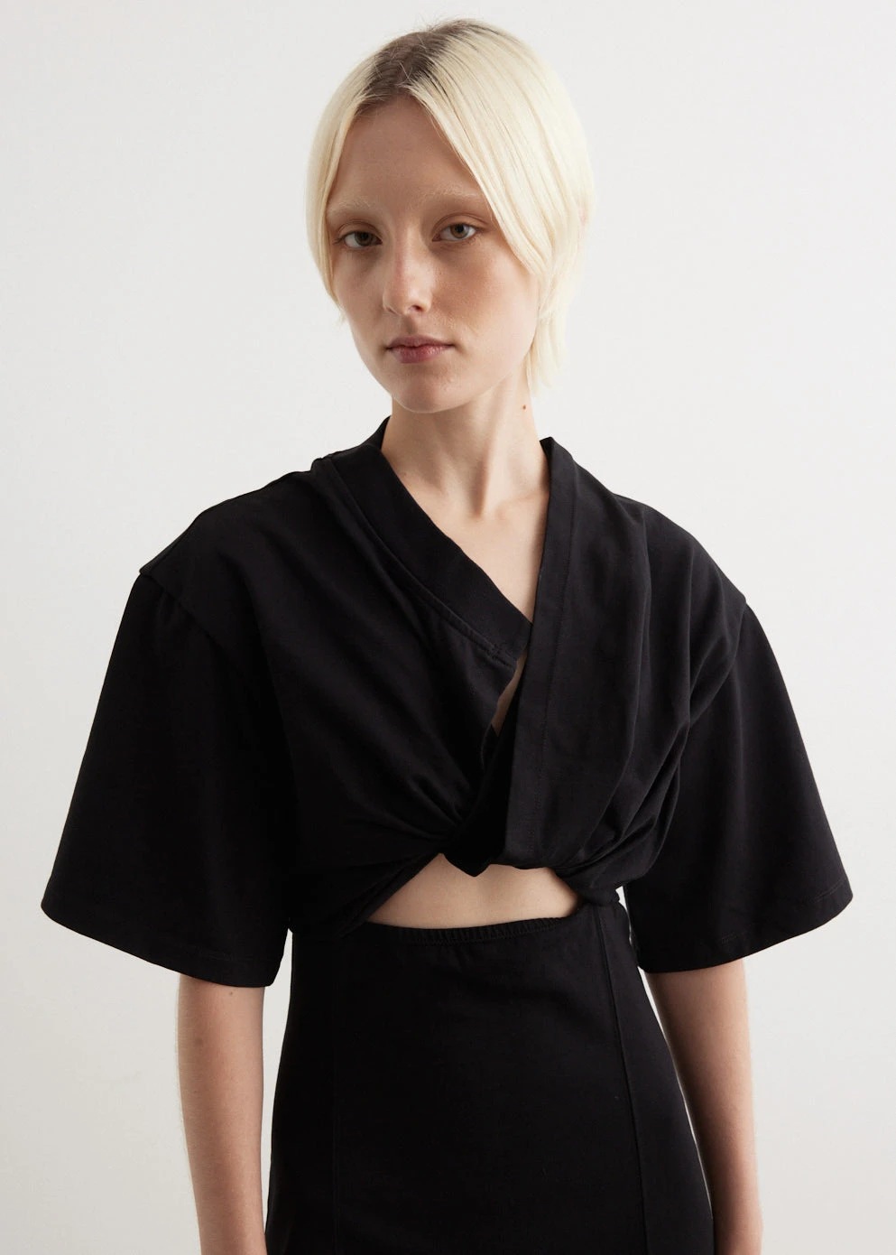 Vivacious and modernist French fashion-house, Jacquemus, can be described as a phenomenon. The brand’s accessories and ready-to-wear collections are consistently awe-inducing season after season. Sculptural and flattering, the La Robe T-Shirt Bahia Dress has a twisted design tailored to a boxy, slim fitted silhouette. Â